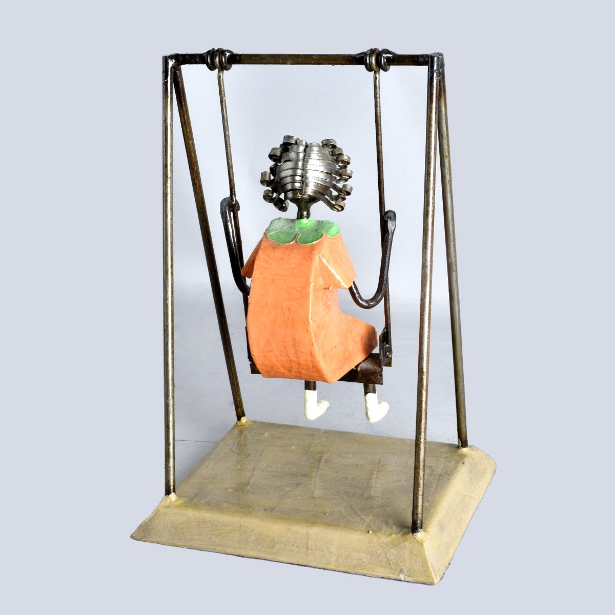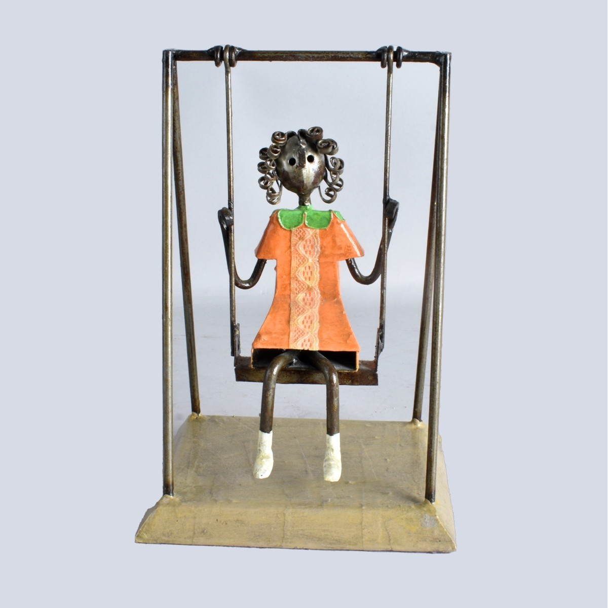 Manuel Felguerez, Mexican (1928 - 2020) "Young Boy on Swing Set" Enamel Painted Steel Sculpture, Signed. Label attached on the bottom. Measures 12" x 8" x 6-3/8". Estimate: $100.00 - $200.00 Domestic Shipping: $88.00 Condition: Good condition.