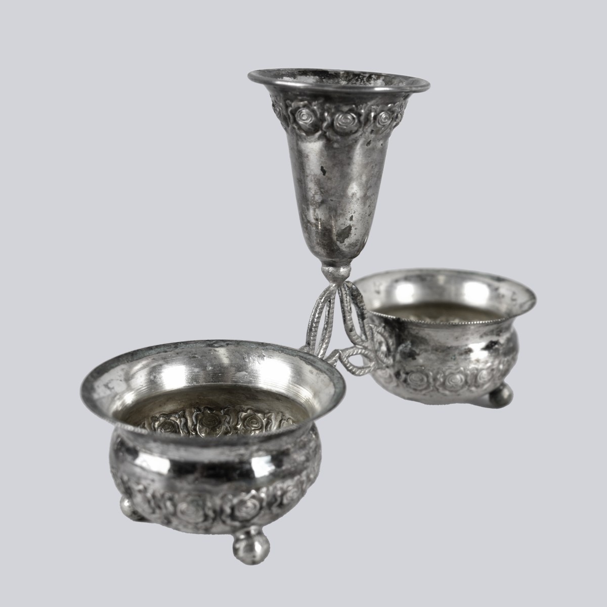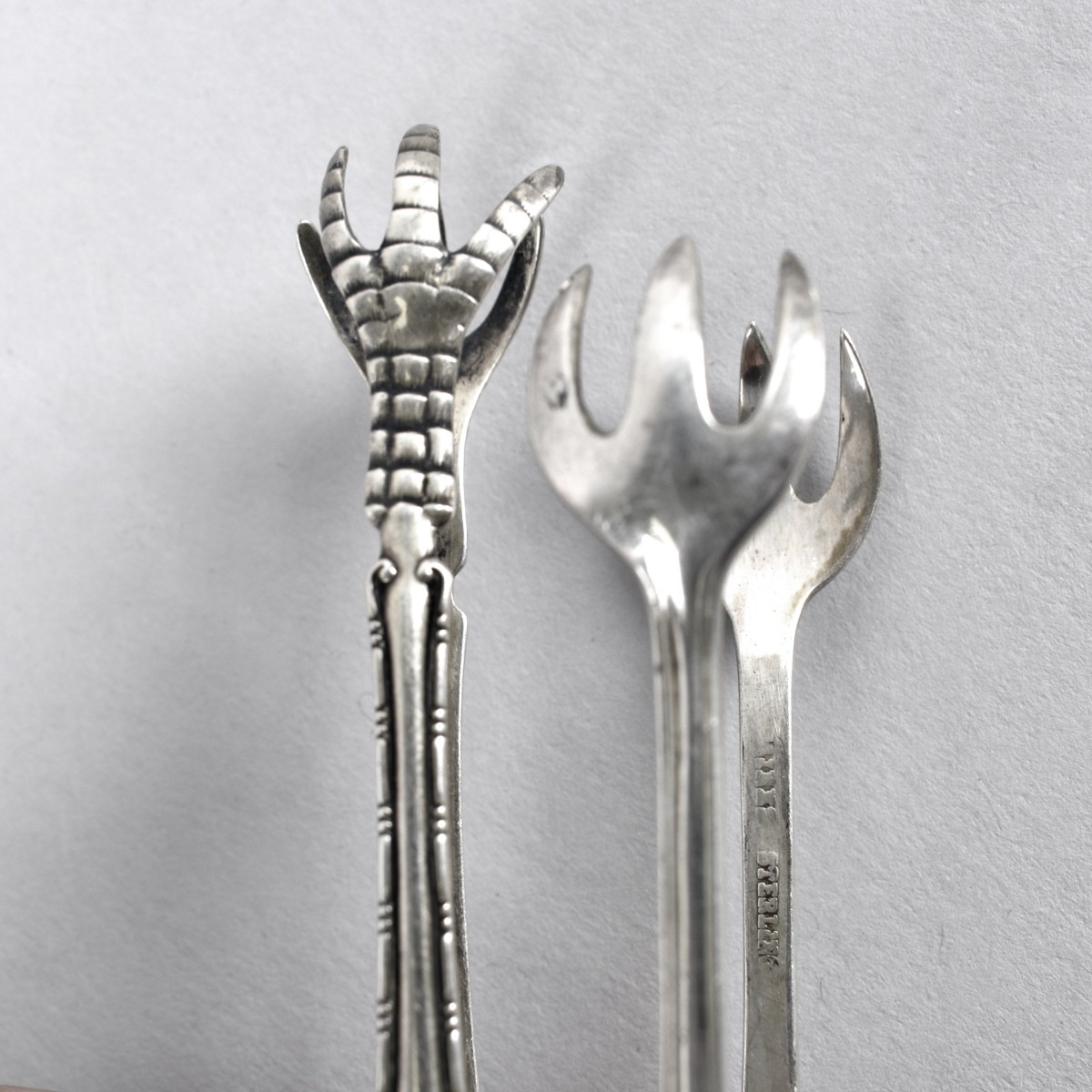 Grouping of Six Vintage Assorted Silver Tableware to Include Hazorim 800 Silver Condiment / Candle holder, English Silver Shaker, Four Sterling Silver Shakers, (2) Sterling Silver Sugar Tongs, Sterling Silver Pusher, Sterling Silver Handled Fork. Each are stamped or hallmarked. v measures 3-1/4" x 4-3/4". Largest sugar tong measures 5-1/4". Approx. weight: 5.90 troy ounces (without handled fork). Estimate: $100.00 - $200.00 Domestic Shipping: $42.00 Condition: Items may need cleaning or have some dings otherwise good condition.