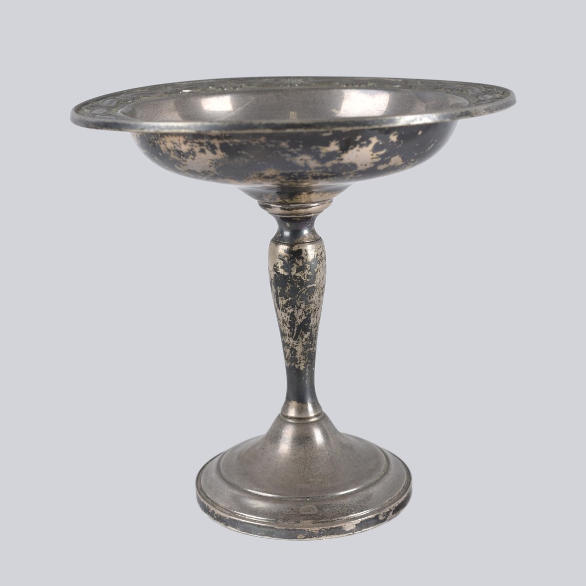 Grouping of Seven Vintage Assorted Sterling Silver Tableware to Include a Gorham Weighted Compote, Reticulated Insert, English Reticulated Bon Bon Dish, 930 Silver Repousse Footed Dish, Israeli Kiddush Cup, Birks Dish, Woodside Sterling Co Reticulated Dish. Each are individually stamped. Compote measures 6-1/8" x 6-1/4". Dish measures 1-1/8" x 6". Approx. weight: 10.11 troy ounces (without compote).. Estimate: $100.00 - $200.00 Domestic Shipping: $55.00 Condition: Compote needs cleaning otherwise good condition.