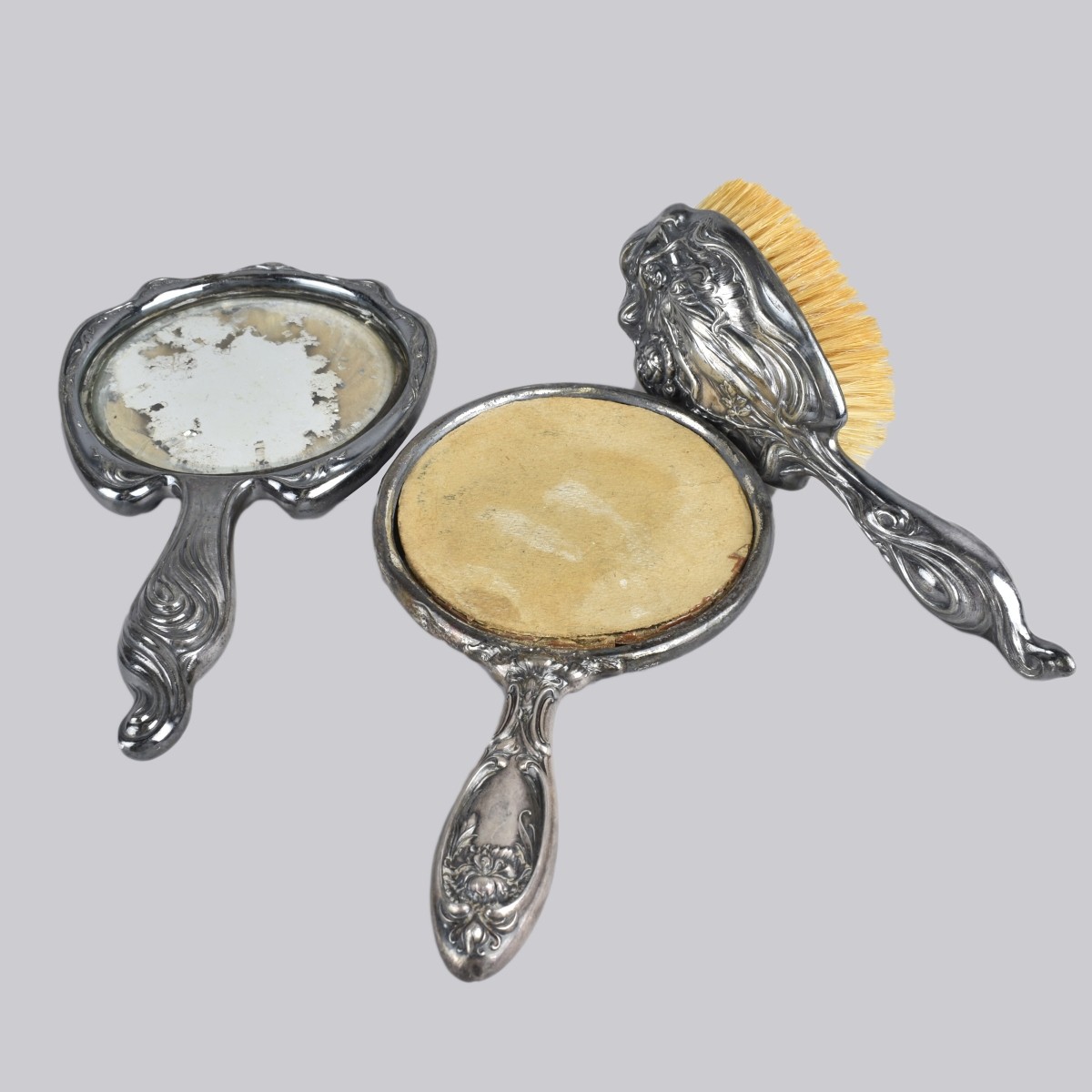 Lot f Three Antique Derby Silver Co. Art Nouveau Style Dresser Top Items to Include Two Mirrors and a Brush. Stamped. Largest mirror measures 10" x 5-3/4". Brush measures 9" x 3-1/2" x 2-1/4". Estimate: $50.00 - $100.00 Domestic Shipping: $58.00 Condition: Mirrored glass are in as is condition. Needs cleaning.