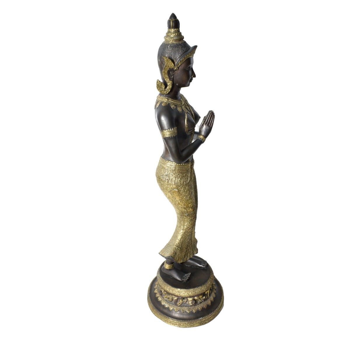 Large 20th Century Bronze Sculpture of a Thai Dancer. Measures 46-3/4" x 13-1/2" x 14-1/2". Estimate: $250.00 - $500.00 Domestic Shipping: Third party Condition: Green spotting to a few areas otherwise good condition.