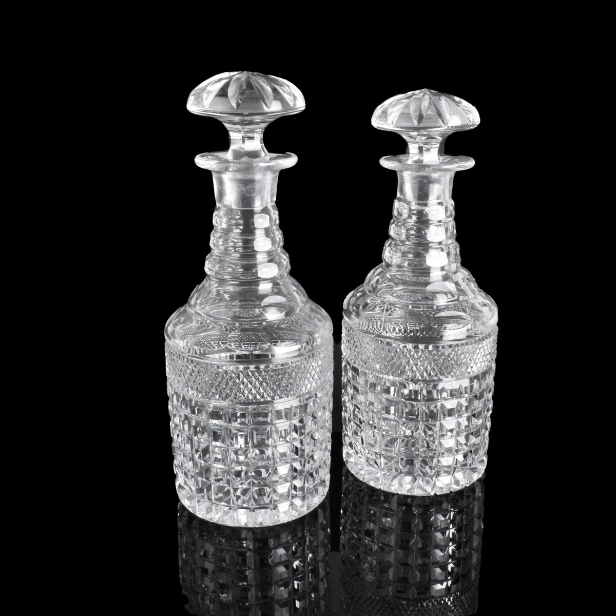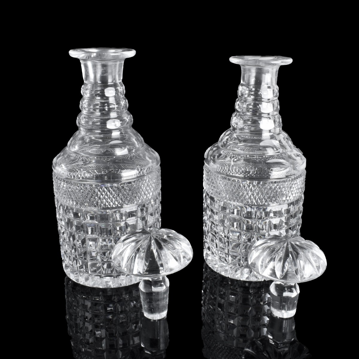 Pair of Regency Style Cut Crystal Decanters. Unsigned. Square and diamond cut pattern. Measures 11-1/8" x 4-1/4". Estimate: $100.00 - $300.00 Domestic Shipping: $88.00 Condition: Good condition.