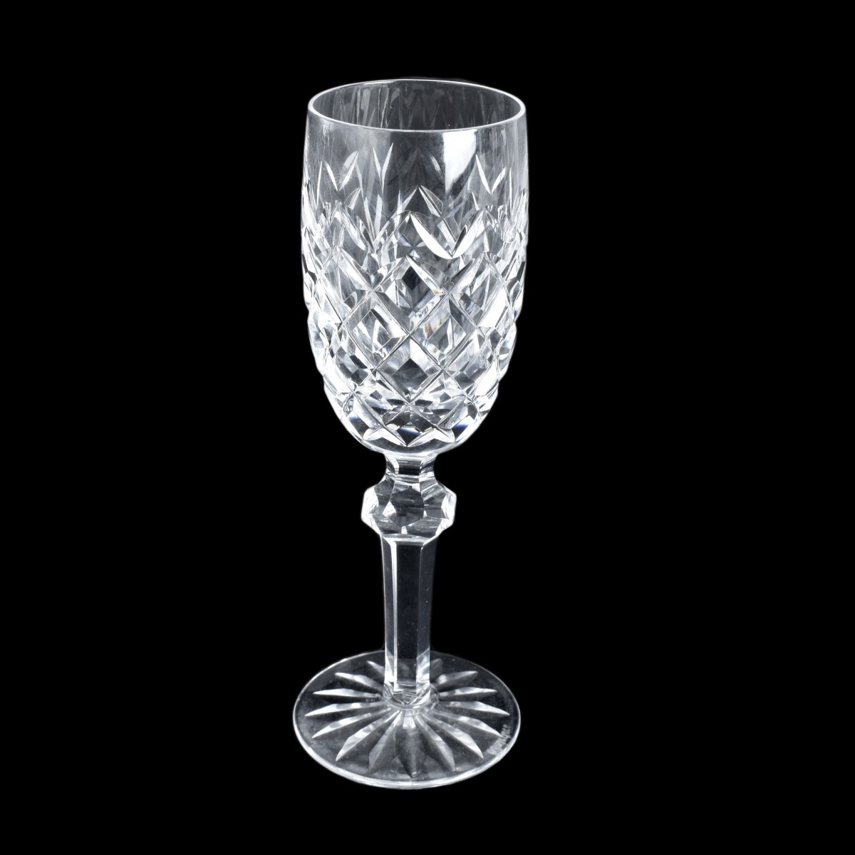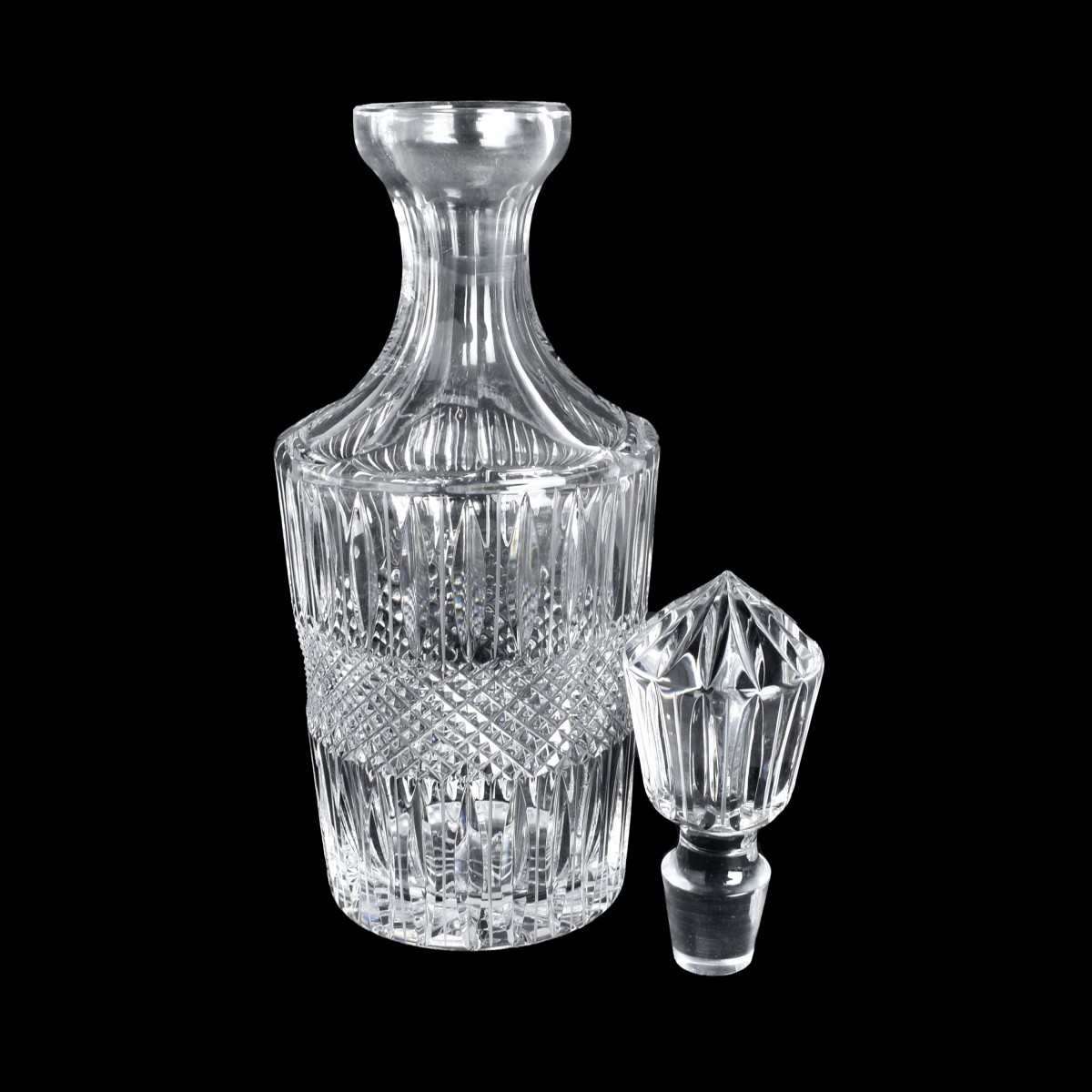 Lot of Four Vintage Assorted Crystal Tableware. Includes a Waterford decanter, pair of Waterford "Powerscourt" sherry glasses, along with a unsigned decanter. Waterford items are signed. Decanter measures 13-1/8" x 4". Unsigned decanter measures 12-1/4" x 4-1/8". Estimate: $200.00 - $300.00 Domestic Shipping: Third party Condition: Unsigned decanter has a small nick to the bottom of the stopper otherwise all in good condition.