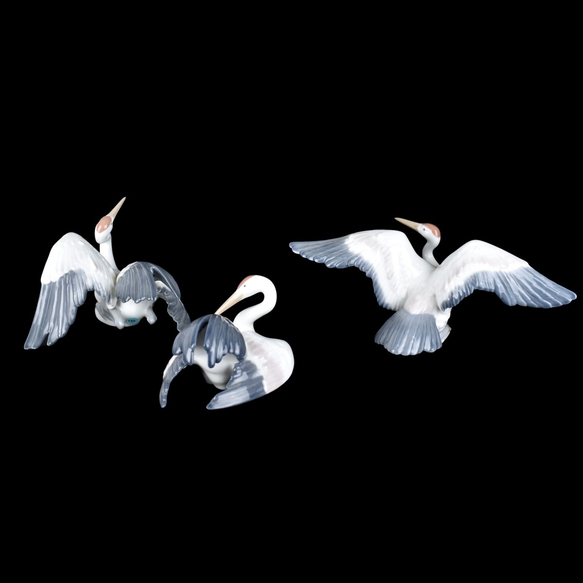 Lot of Three Vintage Lladro Porcelain Figurines to Include "Landing Crane", "Fluttering Crane", and "Nesting Crane". Each figure is properly signed and numbered. Tallest measures 3-1/8" x 8-3/4" x 4-3/4". Smallest measures 2-1/2" x 3-1/4" x 4-1/2". Estimate: $100.00 - $300.00 Domestic Shipping: $66.00 Condition: Good condition.