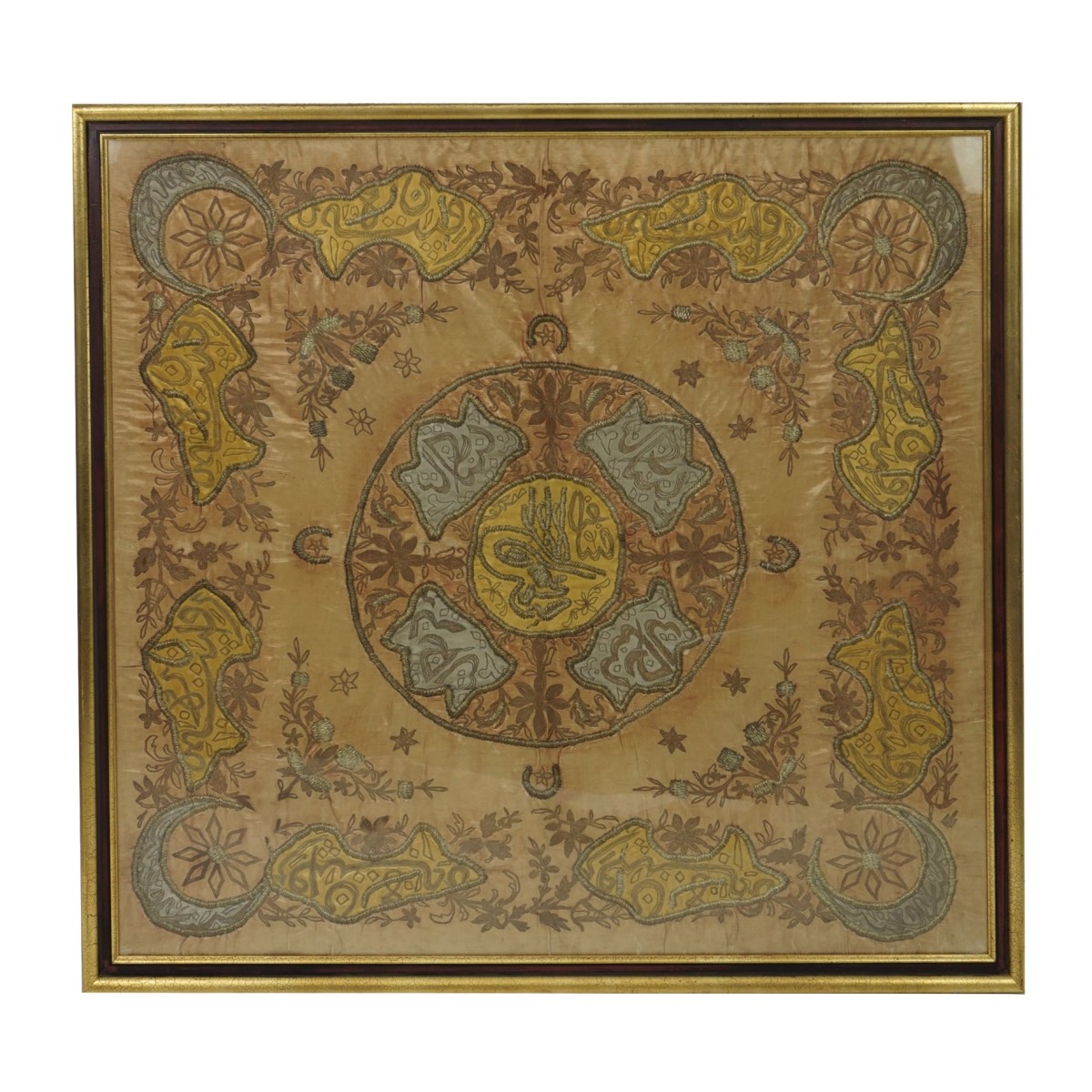 Antique Framed Persian Silk Embroidered Panel. Measures 34" x 35-3/8", frame measures 37-1/4" x 38-1/2". Estimate: $150.00 - $600.00 Domestic Shipping: Third party Condition: Some deterioration wear, toning otherwise good condition.