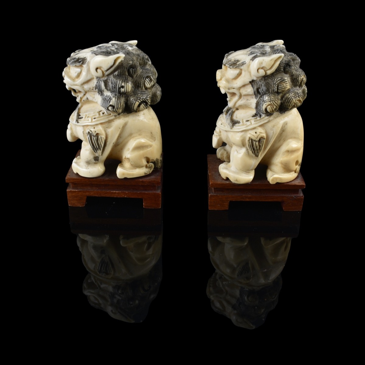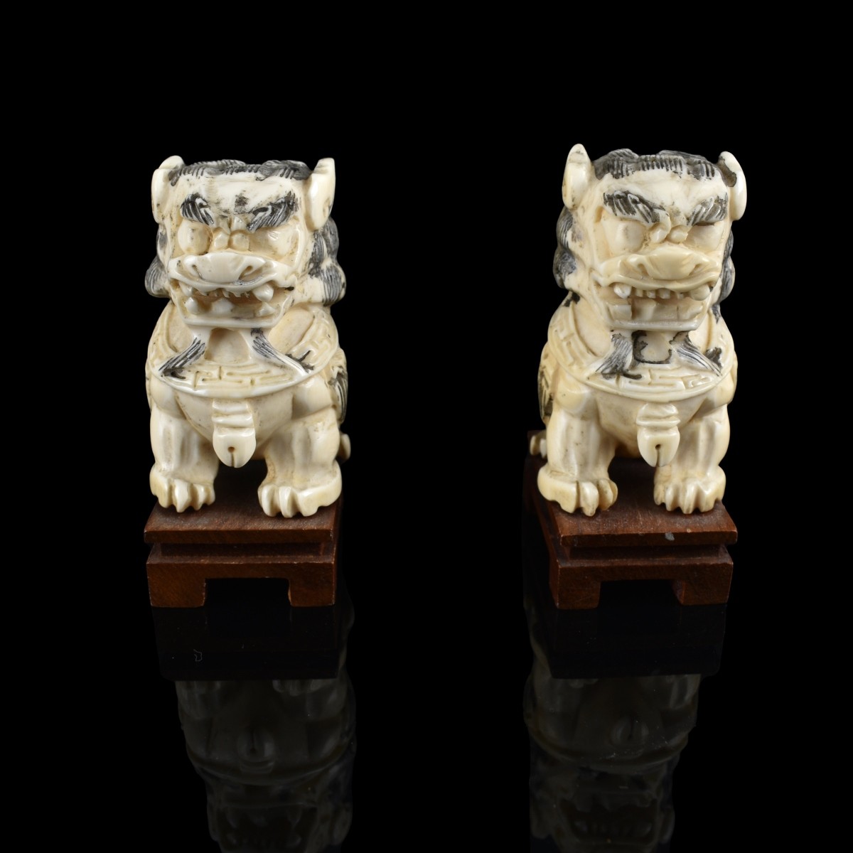Pair of Chinese Miniature Polychrome Carved Foo Dog Figurines Presented on a Wooden Base. Measures 2-1/2" x 1-1/8" x 1-1/2". We Will Not Ship This Item Out of State of Florida. Anyone Having This Item Shipped Must Have a Florida Address or the Item will not be Shipped. We will Not Knowingly Sell Endangered Species outside of Legal Channels. Estimate: $50.00 - $150.00 Domestic Shipping: $40.00 Condition: Good condition.