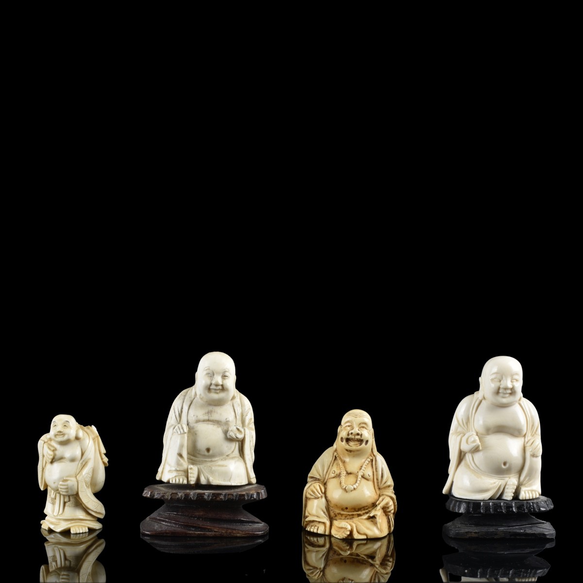 Lot of Four Chinese Carved Buddha Figurines. Each item is properly signed. Tallest measures 3-1/8". We Will Not Ship This Item Out of State of Florida. Anyone Having This Item Shipped Must Have a Florida Address or the Item will not be Shipped. We will Not Knowingly Sell Endangered Species outside of Legal Channels. Estimate: $50.00 - $150.00 Domestic Shipping: $40.00 Condition: One figurine has a loss to the staff otherwise good condition.