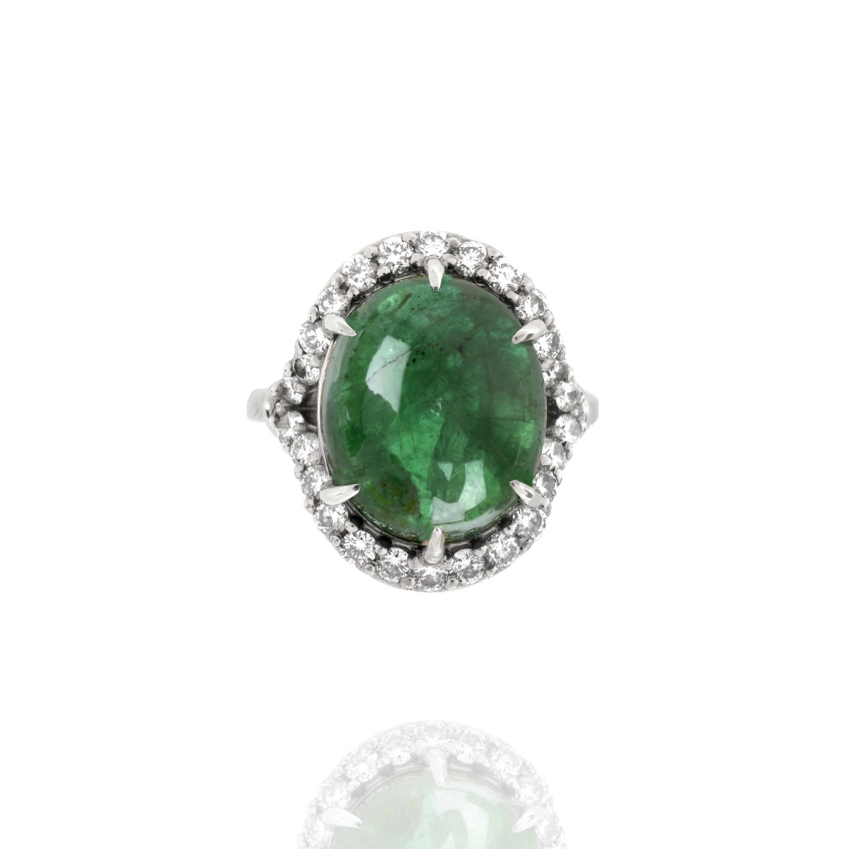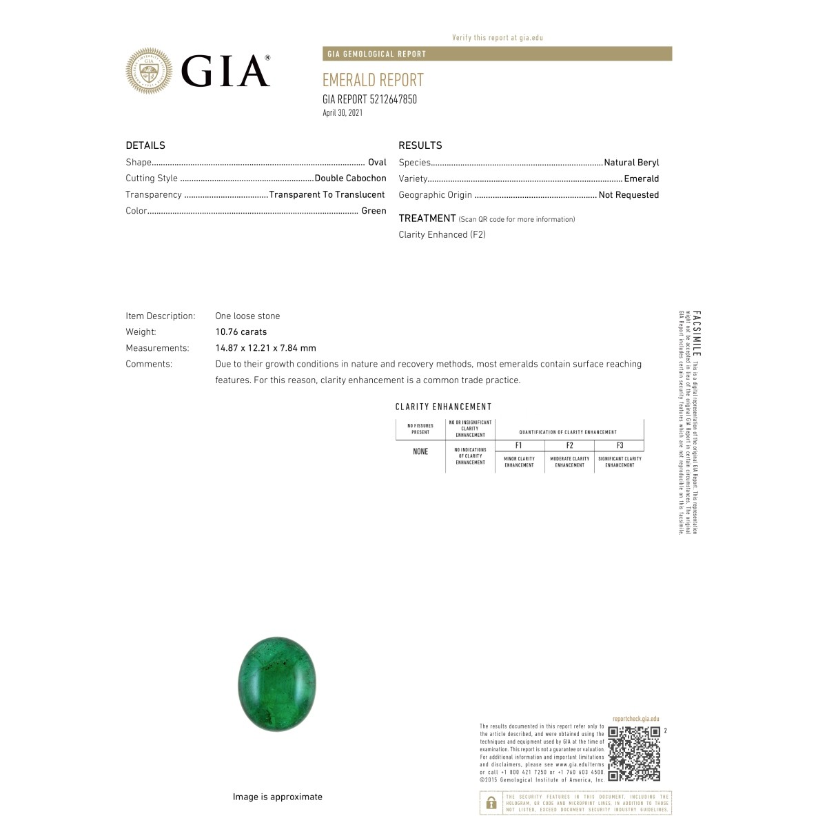 GIA Certified 10.76 Carat Oval Double Cabochon Emerald, Approx. .92 Carat TW Round Brilliant Cut Diamond and 14 Karat White Gold Ring. Diamonds G-H color, VS1-VS2 clarity. Stamped 14K. Ring size 7. Approx. weight: 9.56 grams. GIA Report 5212647850 dated 4/30/2021 to accompany this Lot. Estimate: $2500.00 - $4000.00 Domestic Shipping: $36.00 Condition: Very good condition. Please refer to GIA report for details. For additional information and/or WhatsApp video please contact our resident GIA Graduate Gemologist, Russ Kodner at 954.650.5030