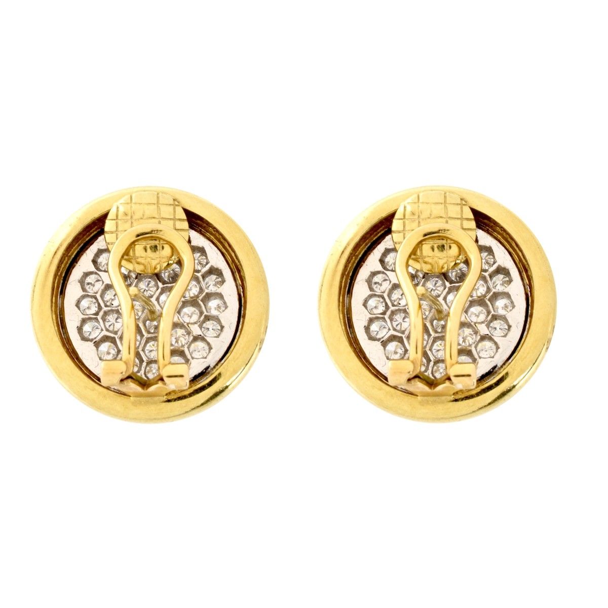 Retro Circa 1950s Approx. 4.0-4.50 Carat TW Pave Set Round Brilliant Cut Diamond and 18 Karat Yellow and White Gold Earrings. Diamonds E-F color, VS1 clarity. Stamped 18K 750. Measure 7/8" diameter. Approx. weight: 23.33 grams. Estimate: $2500.00 - $3500.00 Domestic Shipping: $40.00 Condition: Very good vintage condition. For additional information and/or WhatsApp video please contact our resident GIA Graduate Gemologist, Russ Kodner at 954.650.5030
