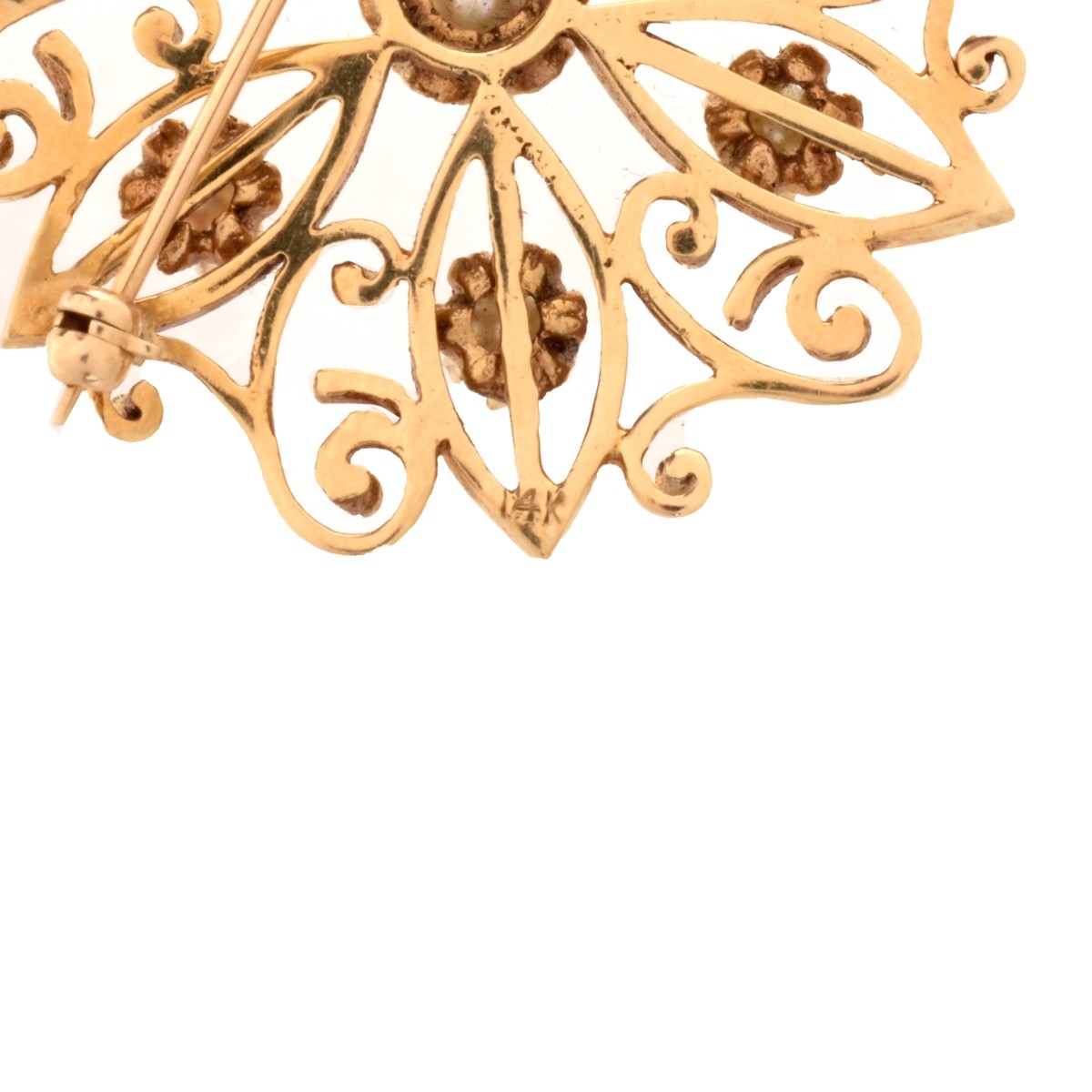 Vintage Seven White Pearl and 14 Karat Yellow Gold Pendant / Brooch. Stamped 14K. Measures 1-3/8" diam. Approx. weight: 11.55 grams. Estimate: $500.00 - $700.00 Domestic Shipping: $36.00 Condition: Very good vintage condition.