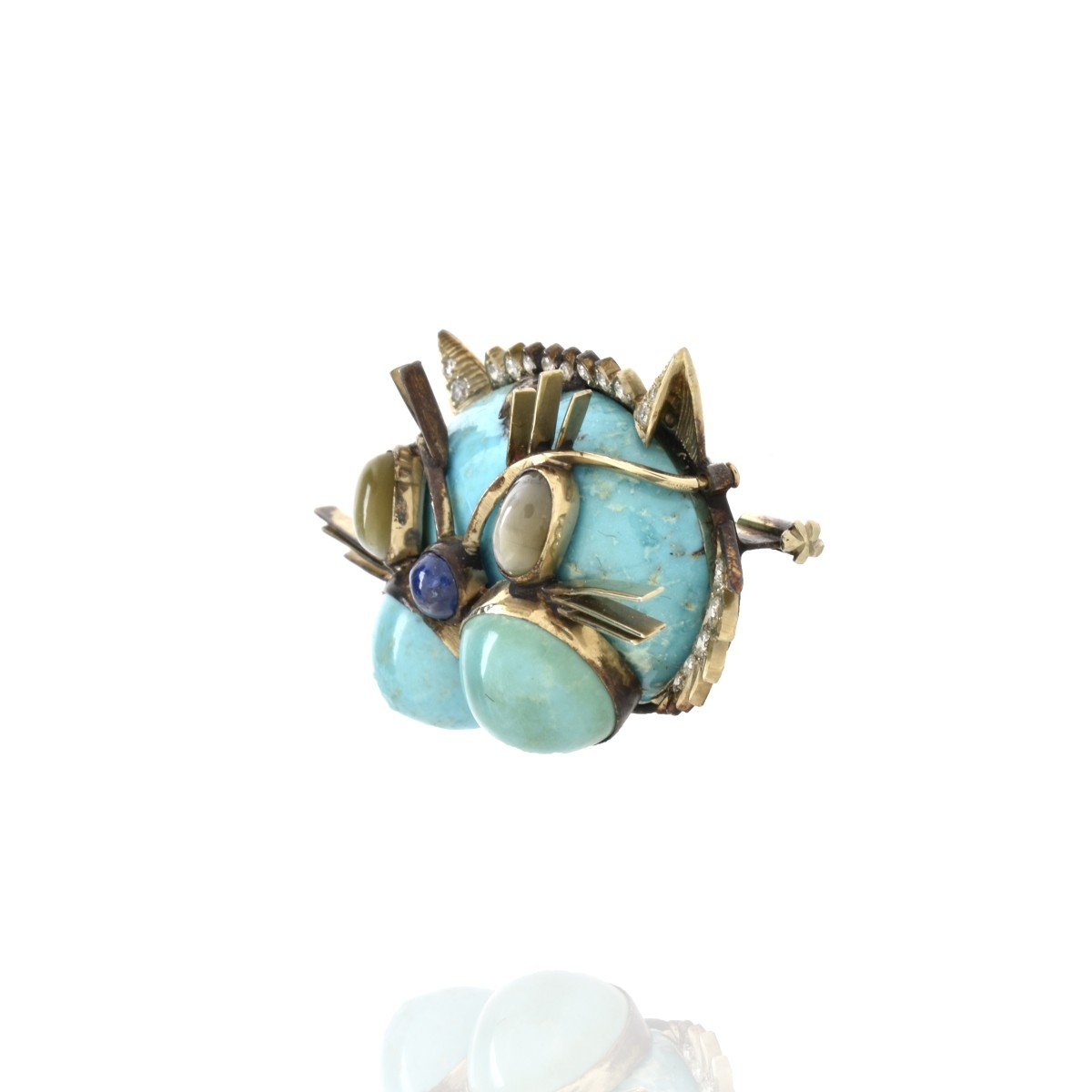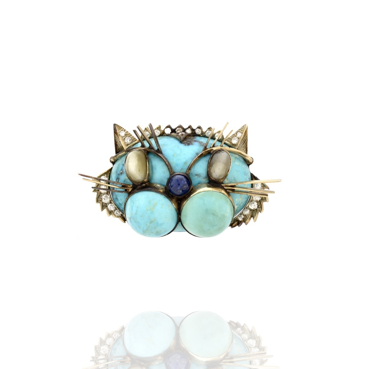 Antique Turquoise and 14 Karat White Gold Cat Brooch. Accented with small round cut diamonds, a cabochon sapphire nose and tiger eye eyes. Measures 7/8" H, 1-5/8" W. Approx. weight: 19.63 grams. Estimate: $400.00 - $600.00 Domestic Shipping: $34.00 Condition: Good antique condition. For additional information and/or WhatsApp video please contact our resident GIA Graduate Gemologist, Russ Kodner at 954.650.5030