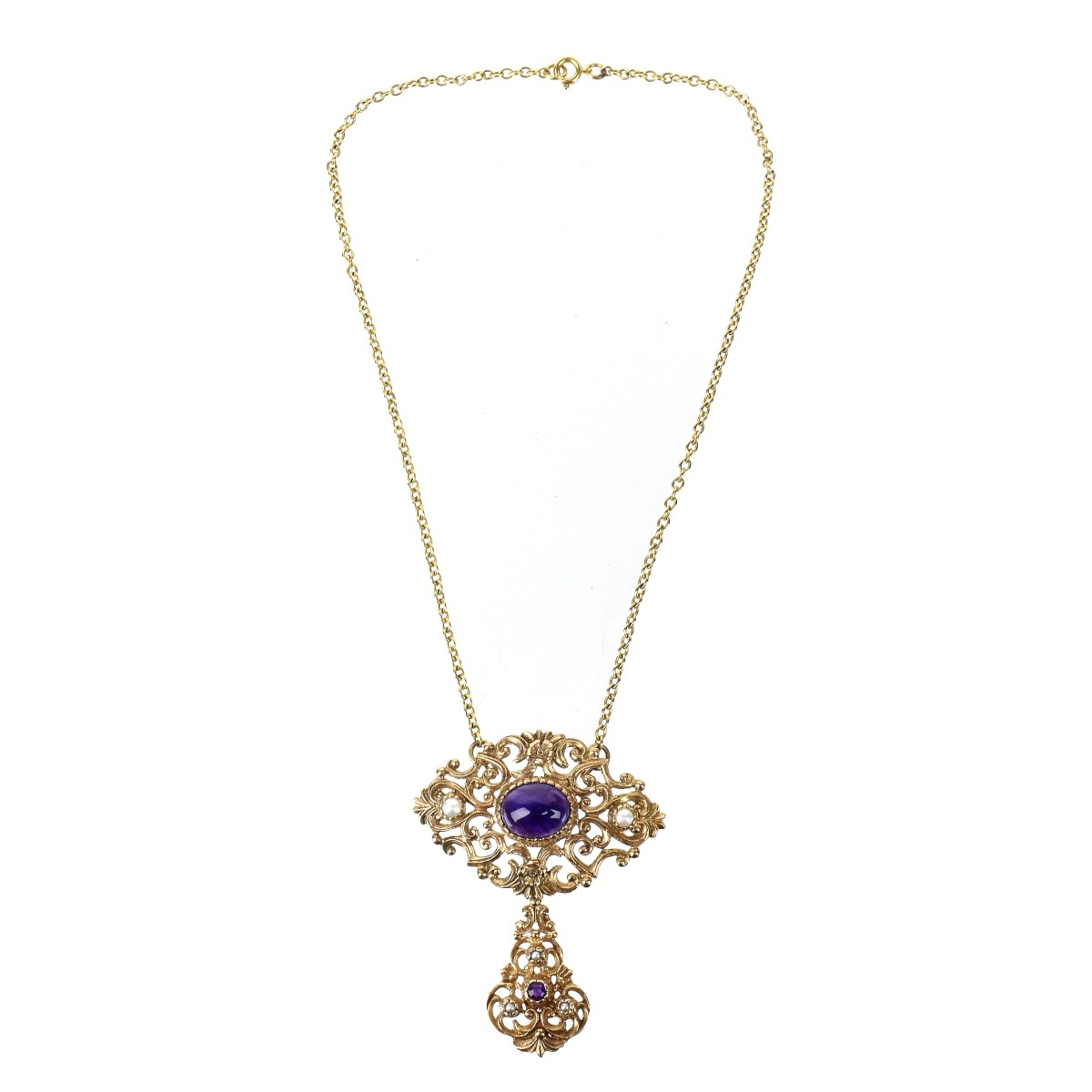 Antique Amethyst, Pearl and 9 Karat Yellow Gold Pendant with 14 Karat Yellow Gold Chain. Pendant stamped .375. Pendant measures 2-1/4" L, 1-3/4" W; chain measures 14" L. Approx. total weight: 10.8 dwt. Estimate: $500.00 - $700.00 Domestic Shipping: $40.00 Condition: Very good antique condition. For additional information and/or WhatsApp video please contact our resident GIA Graduate Gemologist, Russ Kodner at 954.650.5030
