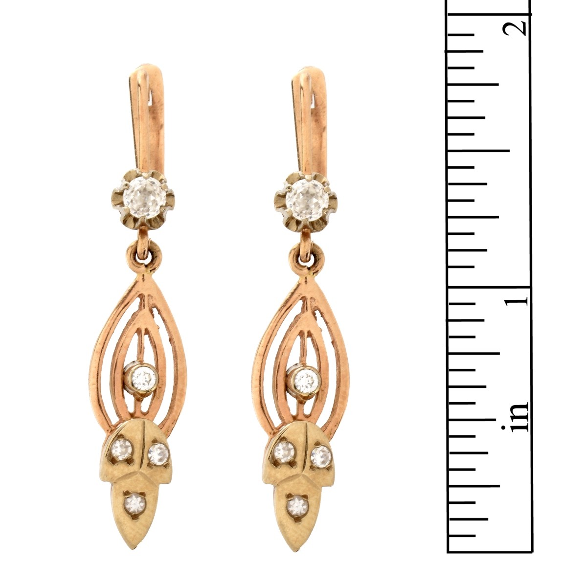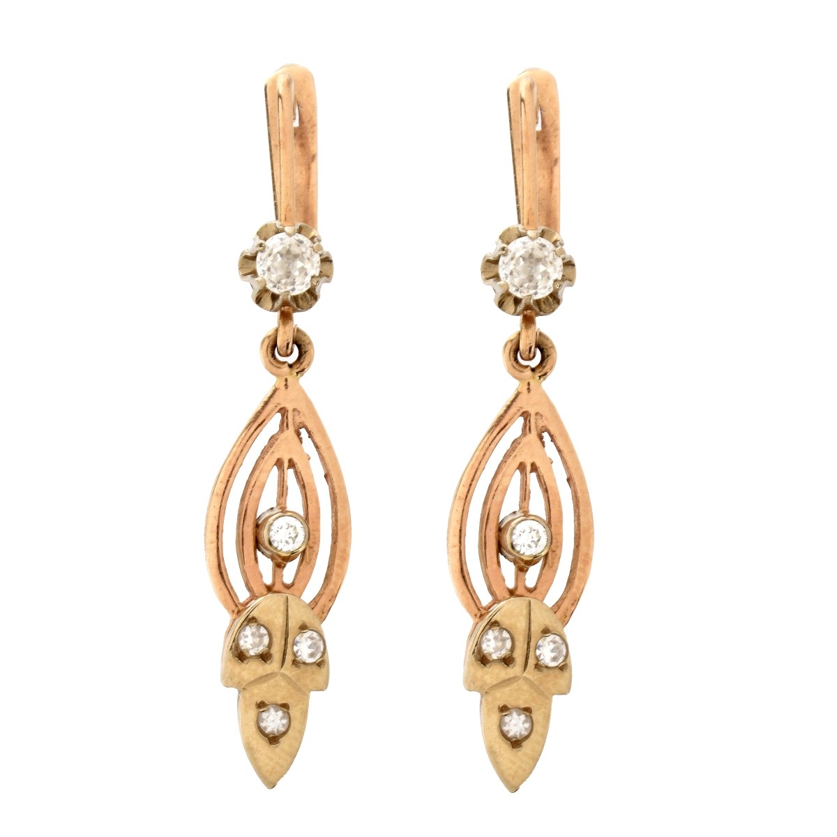 Antique Russian Approx. 1.0 Carat TW Diamond and 14 Karat Yellow Gold Pendant Earrings. Diamonds G-H color, VS1-VS2 clarity. Soviet era hallmark 585. Measure 1-3/4" L, 5/16" W. Approx. total weight: 7.55 grams. Estimate: $800.00 - $1200.00 Domestic Shipping: $40.00 Condition: Very good antique condition. For additional information and/or WhatsApp video please contact our resident GIA Graduate Gemologist, Russ Kodner at 954.650.5030