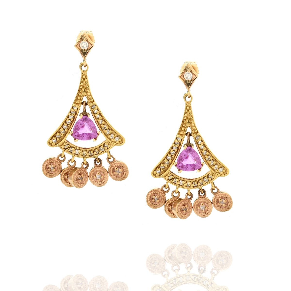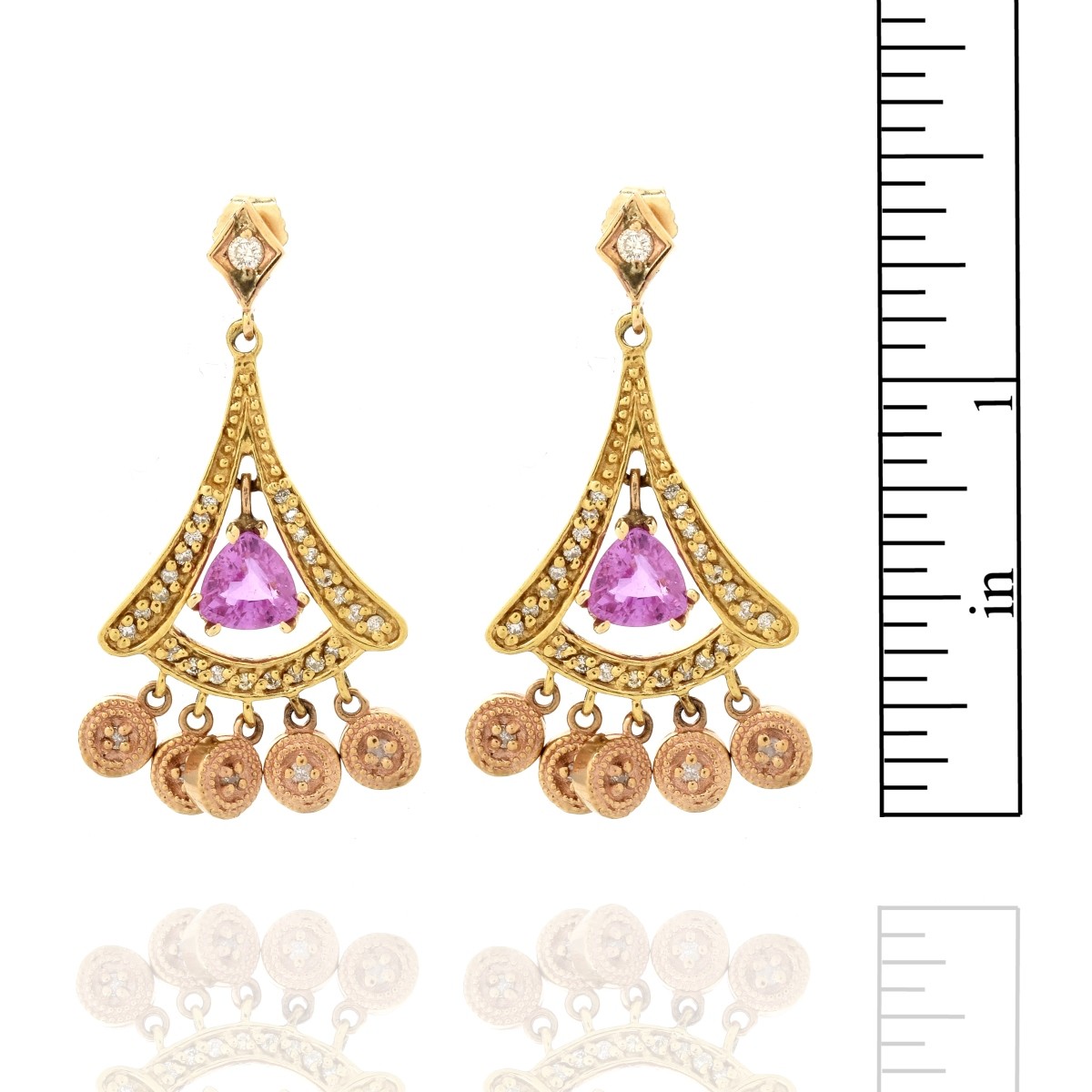 Vintage Pear Shape Ruby, Small Round Cut Diamond and 18 Karat Yellow and Rose Gold Dangle Earrings. Ruby with good color and clarity. Measure 1-1/2" L, 3/4" W. Approx. weight: 6.5 dwt. Estimate: $600.00 - $800.00 Domestic Shipping: $40.00 Condition: Very good condition. For additional information and/or WhatsApp video please contact our resident GIA Graduate Gemologist, Russ Kodner at 954.650.5030