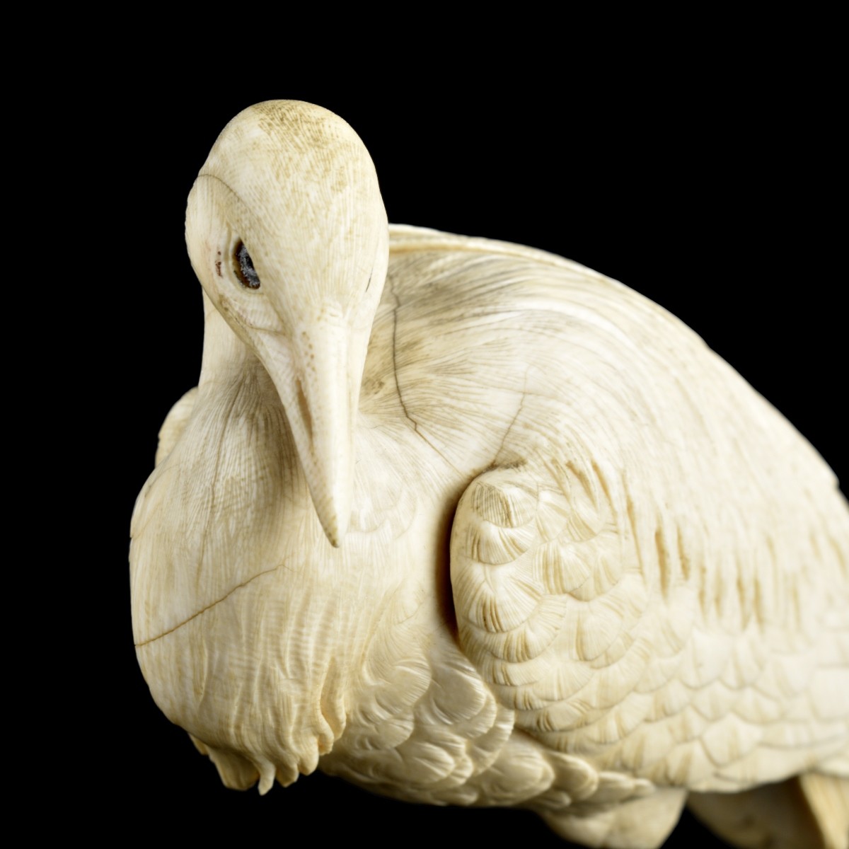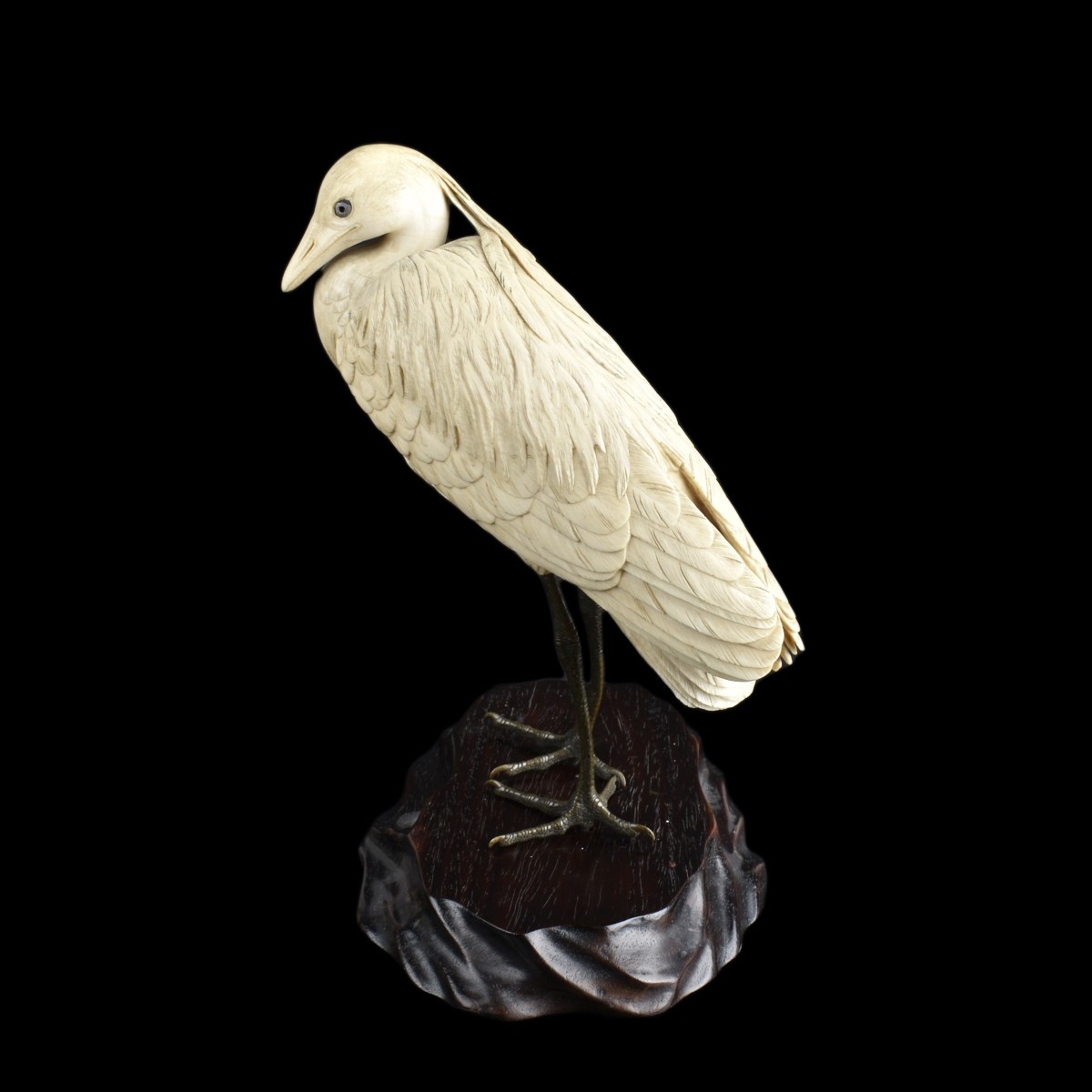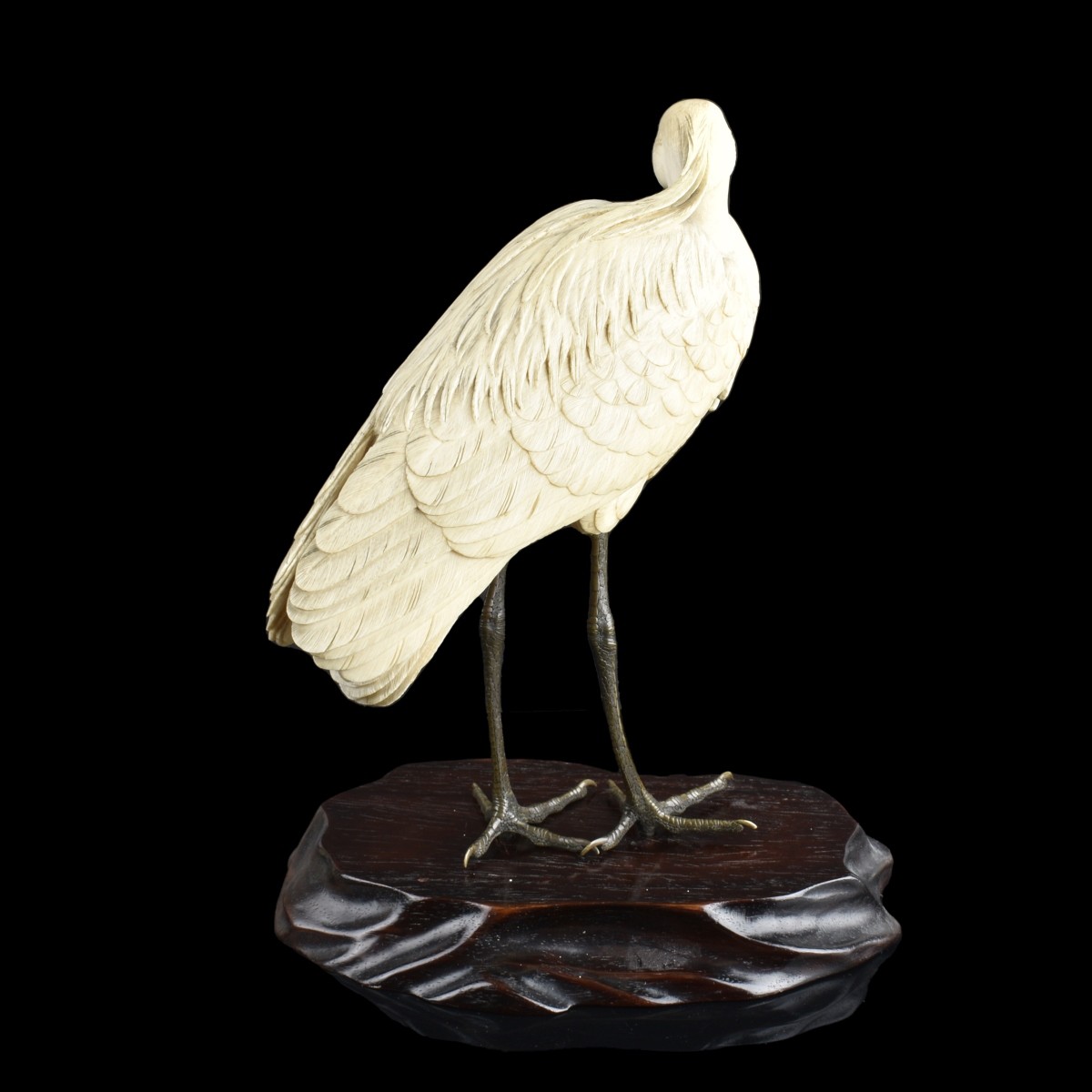 Fine Antique (Meiji Period) Japanese Carved Figurine with Bronze Legs Presented on a Wooden Base. Unmarked. Overall measures 8-1/4" x 6-1/2" x 5-3/4". We Will Not Ship This Item Out of State of Florida. Anyone Having This Item Shipped Must Have a Florida Address or the Item will not be Shipped. We will Not Knowingly Sell Endangered Species outside of Legal Channels. Estimate: $800.00 - $1200.00 Domestic Shipping: $72.00 Condition: Seam splits to the surface otherwise good condition.