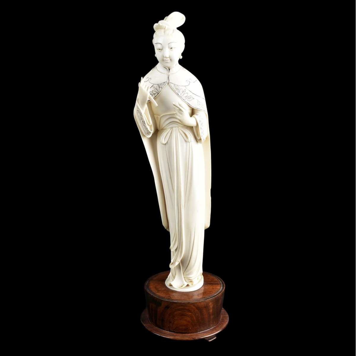 Large Finely Carved Chinese Polychrome Draped Figurine Presented on a Wooden Base. Overall measures 12-5/8" x 3-3/4". We Will Not Ship This Item Out of State of Florida. Anyone Having This Item Shipped Must Have a Florida Address or the Item will not be Shipped. We will Not Knowingly Sell Endangered Species outside of Legal Channels. Estimate: $800.00 - $1200.00 Domestic Shipping: $78.00 Condition: Good condition.