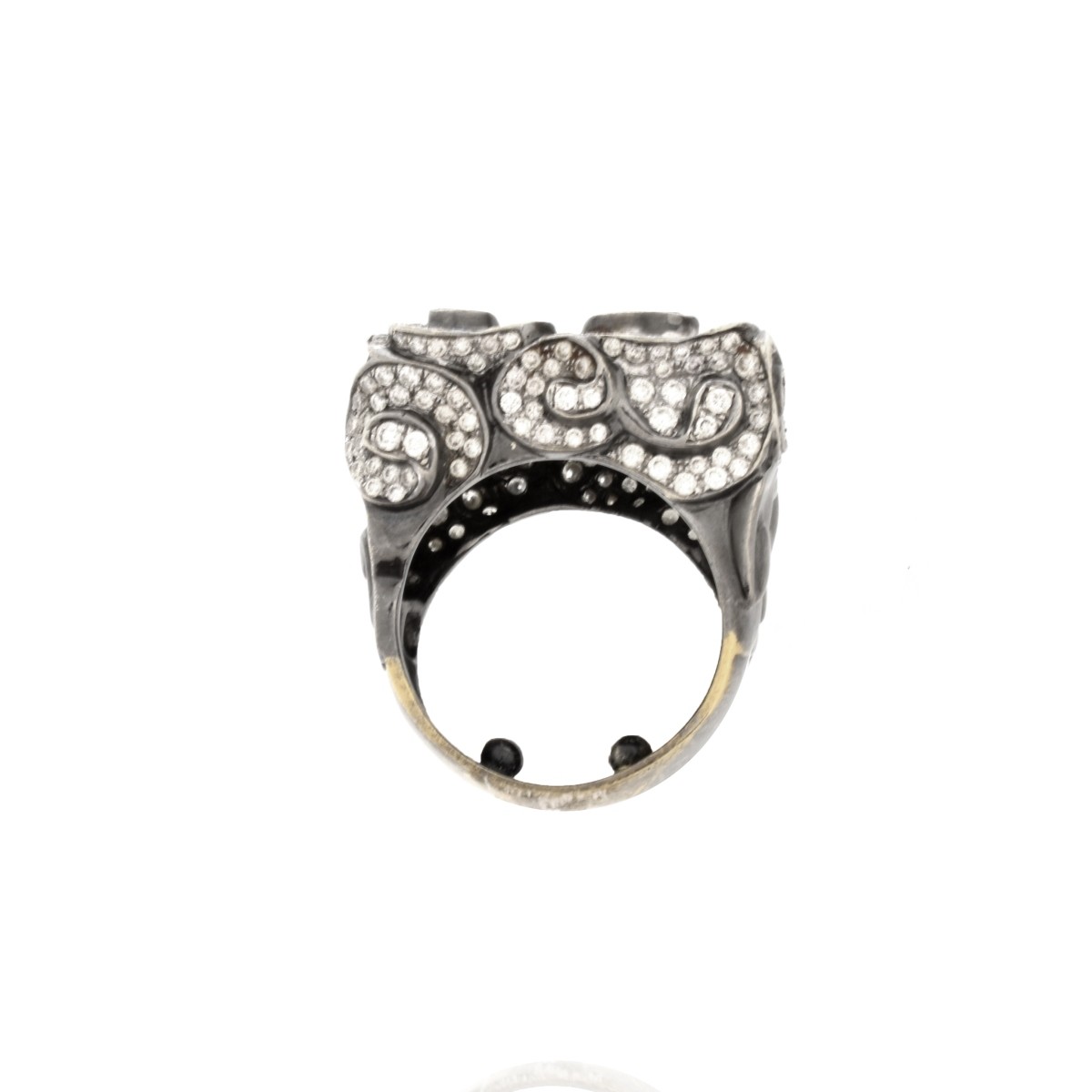 Contemporary Pave Set Round Brilliant Cut Diamond and Blackened 18 Karat Gold Cocktail Ring. Diamonds F-G color, VS1-VS2 clarity. Ring size 5 (with sizing balls). Approx. weight: 24.61 grams. Estimate: $1000.00 - $1500.00 Domestic Shipping: $40.00 Condition: Rubbing to ring shank from normal use. For additional information and/or WhatsApp video please contact our resident GIA Graduate Gemologist, Russ Kodner at 954.650.5030