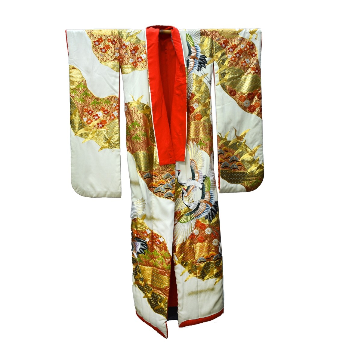 Vintage Japanese Fine Silk Embroidered Uchikake Wedding / Ceremonial Kimono. intricately detailed. Measures 75" (collar to bottom) x 25" (sleeve to sleeve). Estimate: $500.00 - $1000.00 Domestic Shipping: $85.00 Condition: Needs a minor cleaning overall good condition.