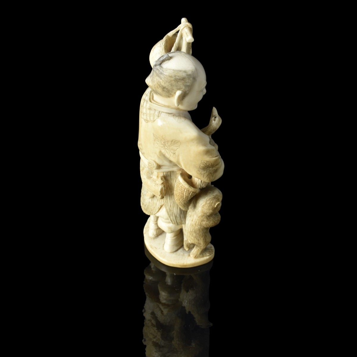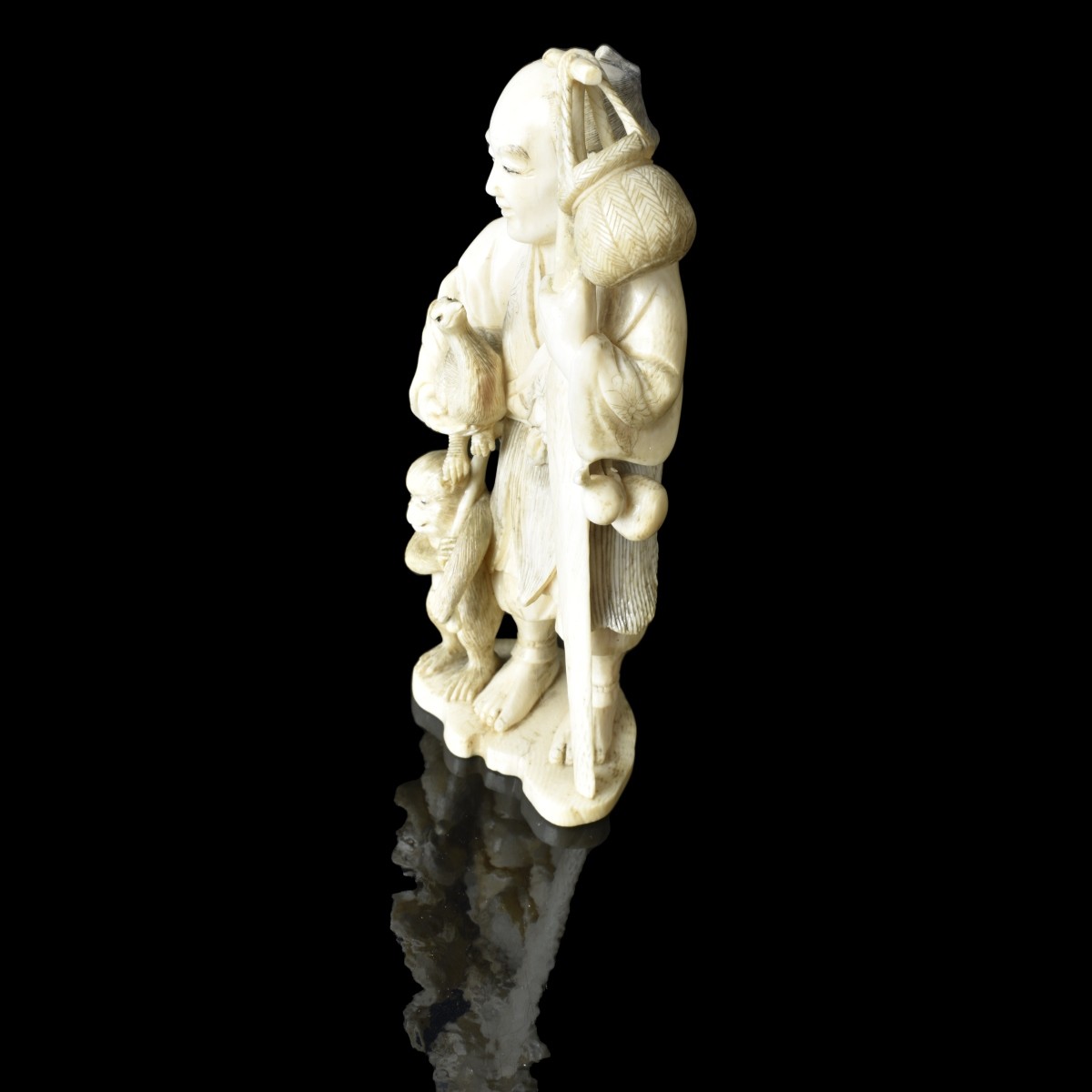 Antique Japanese Polychrome Carved Figurine with Monkey and Bird. Signed. Measures 4-7/8" x 2-1/4". We Will Not Ship This Item Out of State of Florida. Anyone Having This Item Shipped Must Have a Florida Address or the Item will not be Shipped. We will Not Knowingly Sell Endangered Species outside of Legal Channels. Estimate: $200.00 - $300.00 Domestic Shipping: $48.00 Condition: A few stress lines otherwise good condition.