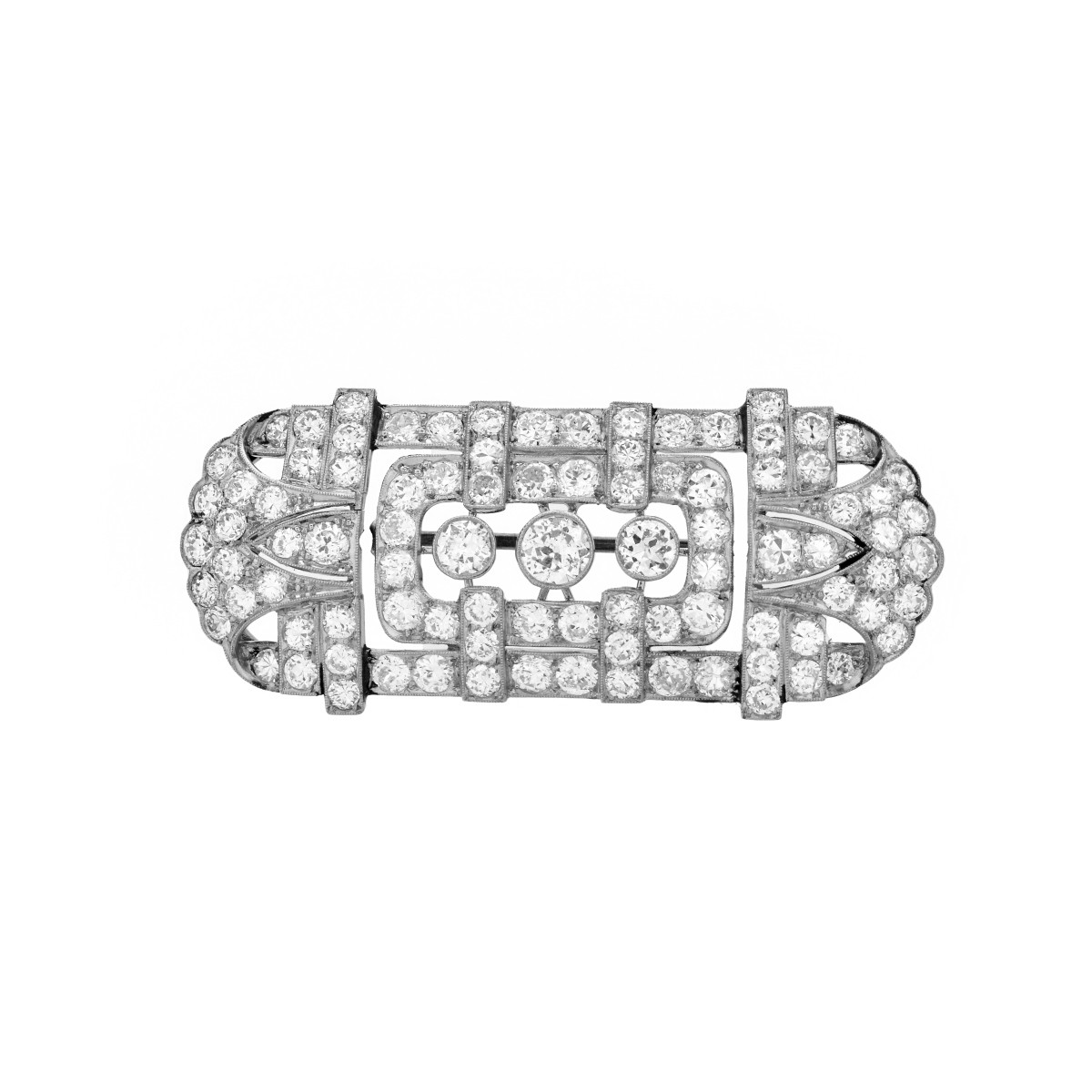 Antique Art Deco Approx. 7.25 Carat TW Old European Cut Diamond and Platinum Brooch. Diamonds E-F color, VS1-SI1 clarity. Measures 1" H, 2-1/8" W. Approx. weight: 14.0 grams. Estimate: $7000.00 - $9000.00 Domestic Shipping: $40.00 Condition: Very good antique condition. For additional information and/or WhatsApp video please contact our resident GIA Graduate Gemologist, Russ Kodner at 954.650.5030