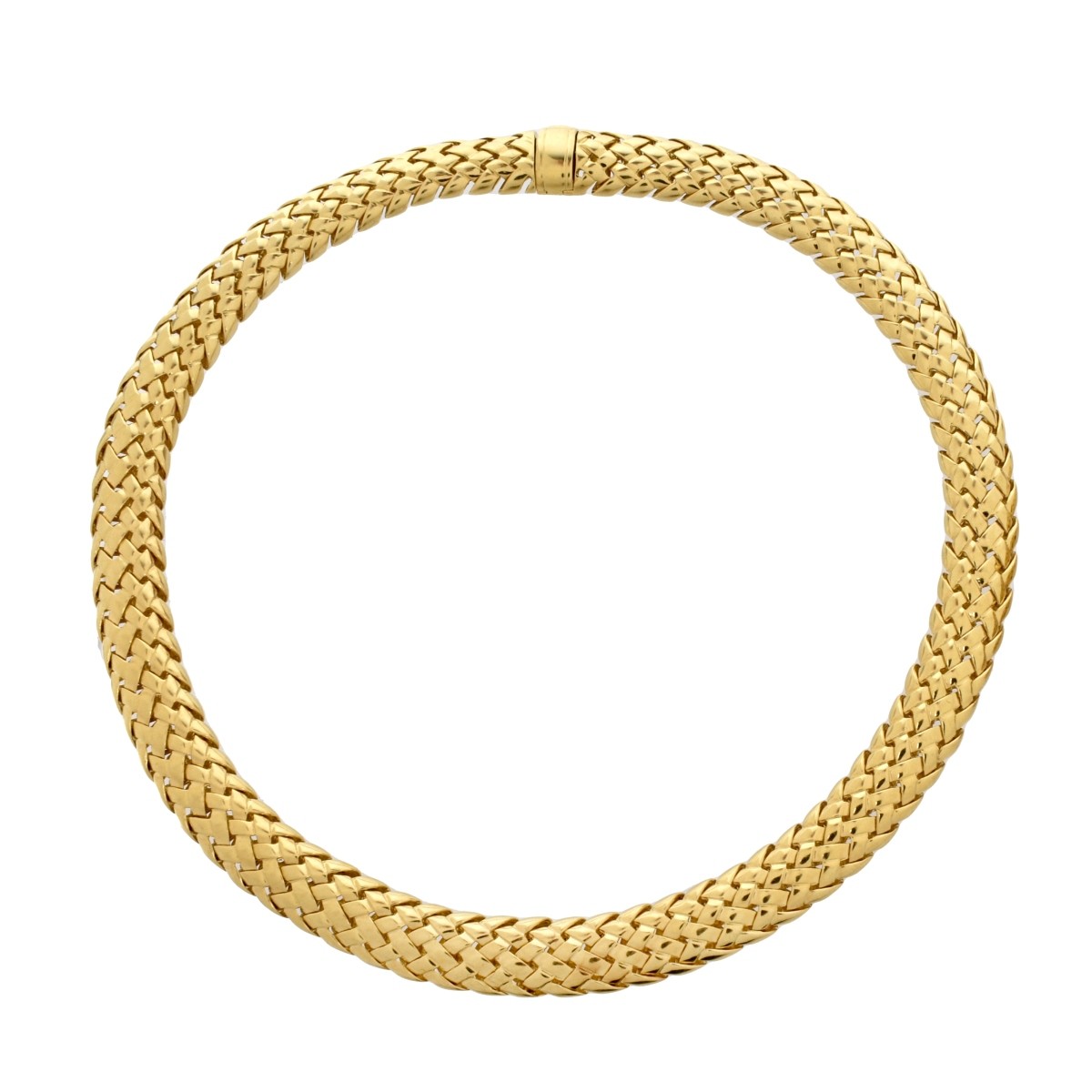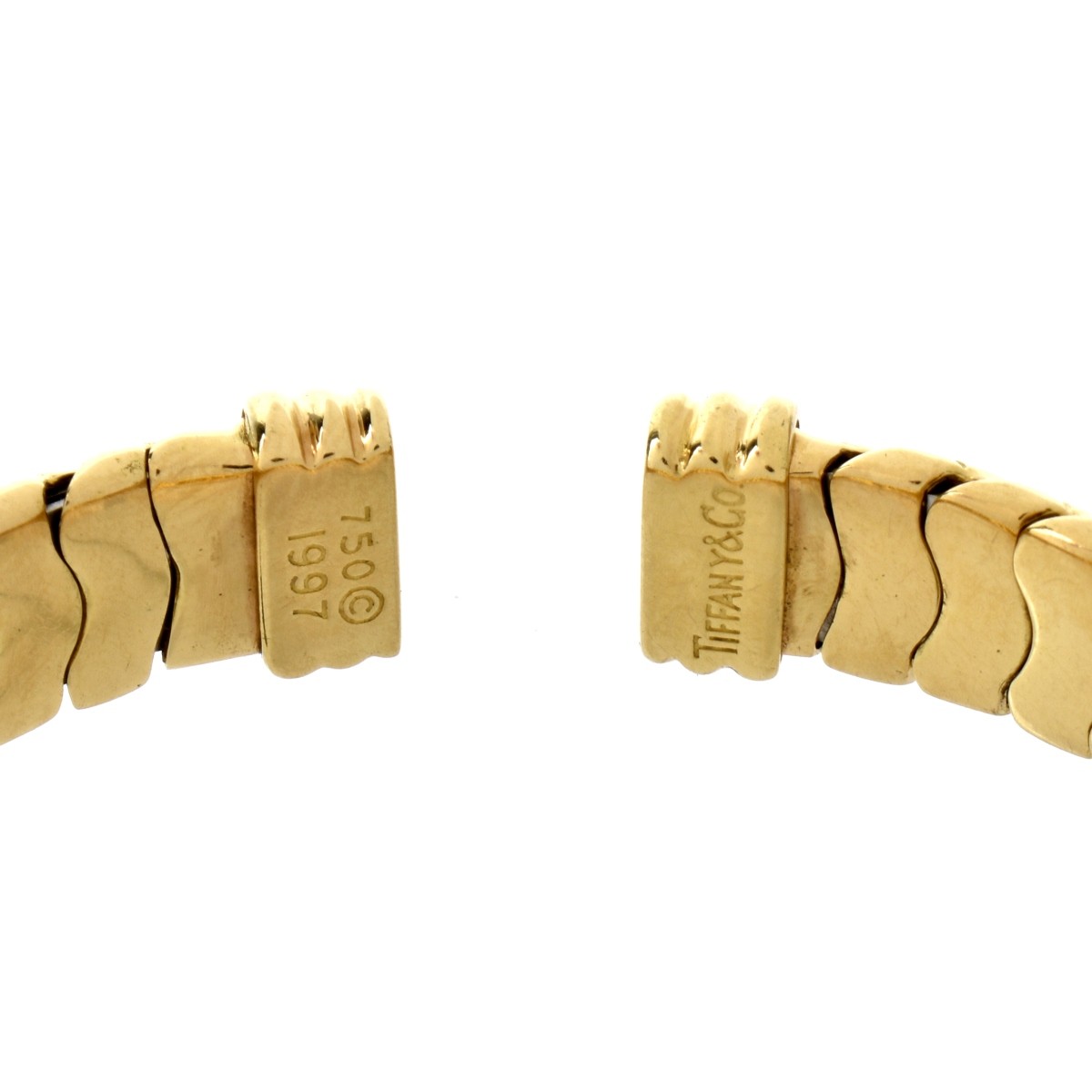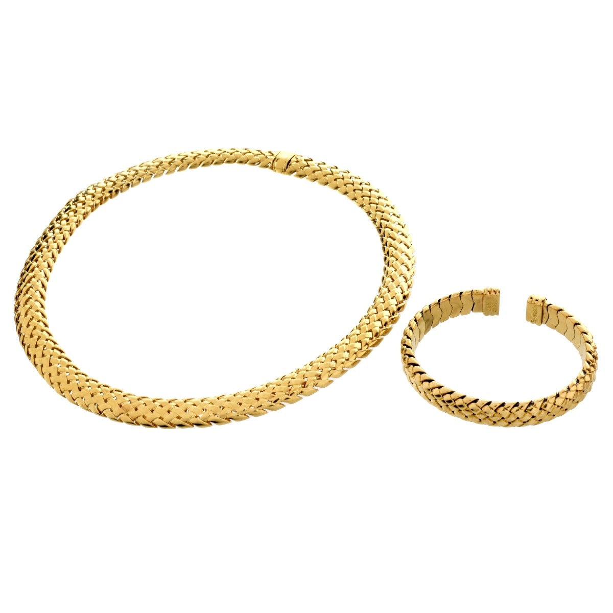 Vintage Circa 1995 Tiffany & Co 18Karat Yellow Gold Lattice Link Necklace and Flexible Cuff Bangle Bracelet. Signed , stamped 750 and 1995. Necklace measures 15-1/2" L, 1/2" W; bangle measures 5-1/2" interior circumference plus 3/8" opening. Approx. total weight: 142.63 grams Estimate: $18,000.00 - $25,000.00 Domestic Shipping: $42.00 Condition: Very good condition. For additional information and/or WhatsApp video please contact our resident GIA Graduate Gemologist, Russ Kodner at 954.650.5030