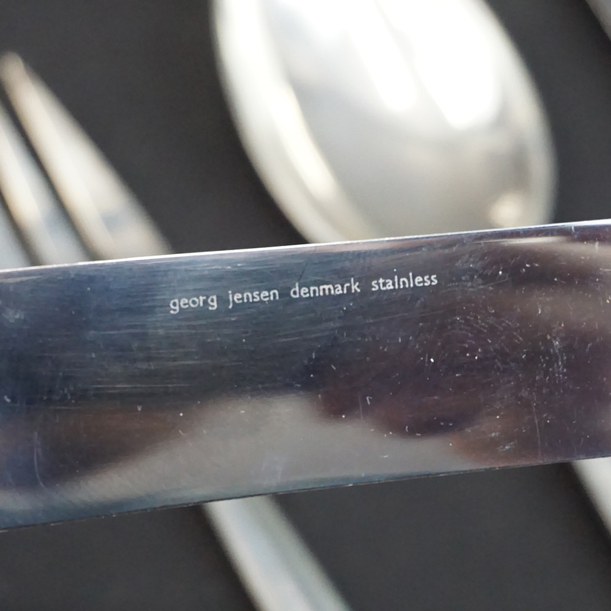 Ninety Eight (98) Piece Georg Jensen "Acanthus" Sterling Silver Flatware. Includes: (12) knives measuring 8-7/8", (12) forks measuring 7-1/8", (12) fish forks, (12) table spoons measuring 7-3/8", (12) teaspoons, (12) small teaspoons, (13) butter spreaders, 2-piece carving set, 2-piece serving set, serving spoon, serving fork, (2) ladles, cake knife, pastry server, youth fork, fork, and a baby knife. Appropriately stamped. Approx. weight: 177.04 troy ounces with handled tableware. Approx. weight: 112.07 troy ounces without handled tableware). Box is for display purposes only. Estimate: $3000.00 - $5000.00 Domestic Shipping: $158.00 Condition: Good condition.