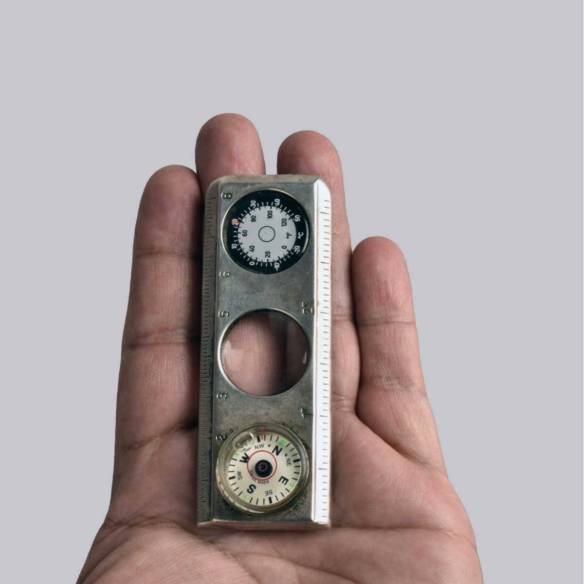 Vintage Tiffany & Co Sterling Silver Compass, Magnifying Glass, Thermometer, and Ruler Tool. Stamped. Measures 3-1/2" x 1-1/4". Estimate: $100.00 - $200.00 Domestic Shipping: $40.00 Condition: Good condition.