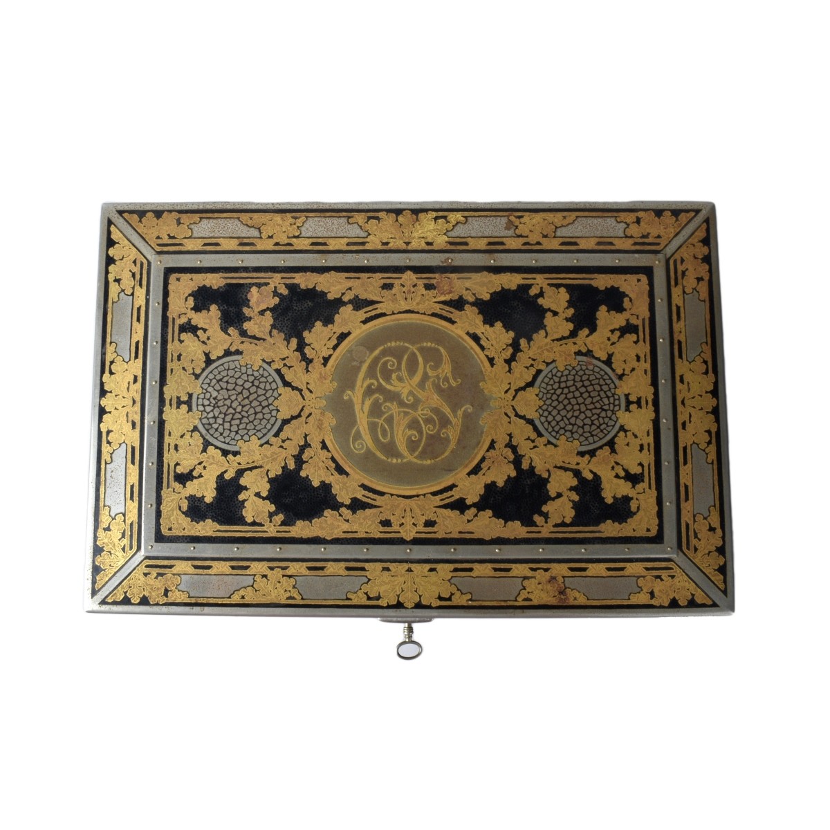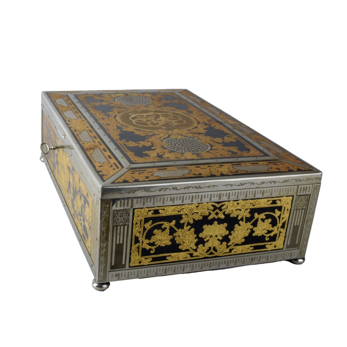 Antique Swedish Ornamentik Eskiltuna Etched Partial Gilt Steel and Enamel Cigar Box. Signed. Measures 5" x 15-5/8" x 10-1/4". Estimate: $800.00 - $1200.00 Domestic Shipping: $115.00 Condition: Slight corrosion to the steel otherwise good condition.