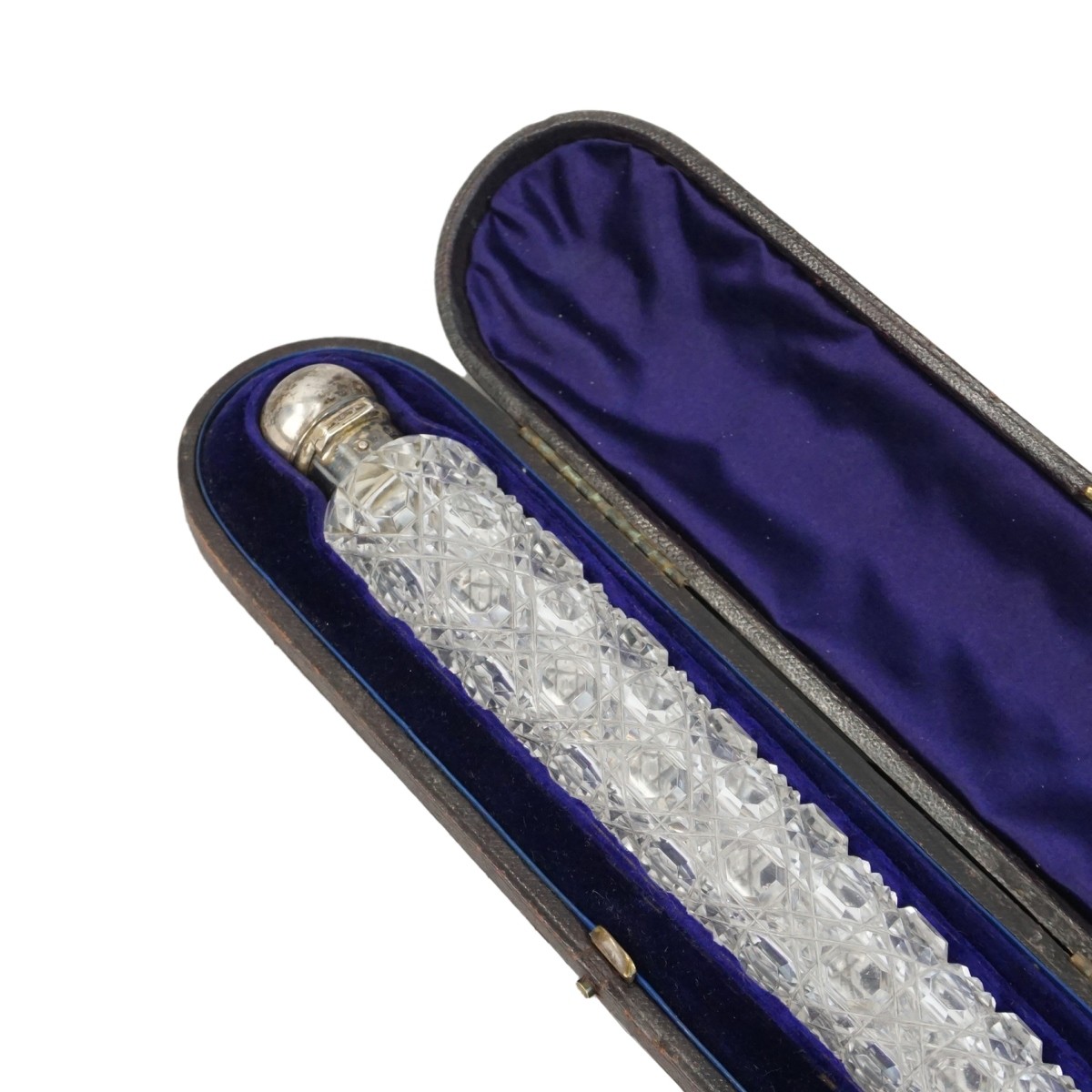 English Silver and Cut Glass Scent Bottle with Fitted Case. Hallmarked. Makers mark: T.J. Bottle measures 10". Case measures 1-1/2" x 11-3/8" x 2-1/2". Estimate: $150.00 - $300.00 Domestic Shipping: $55.00 Condition: Good condition.