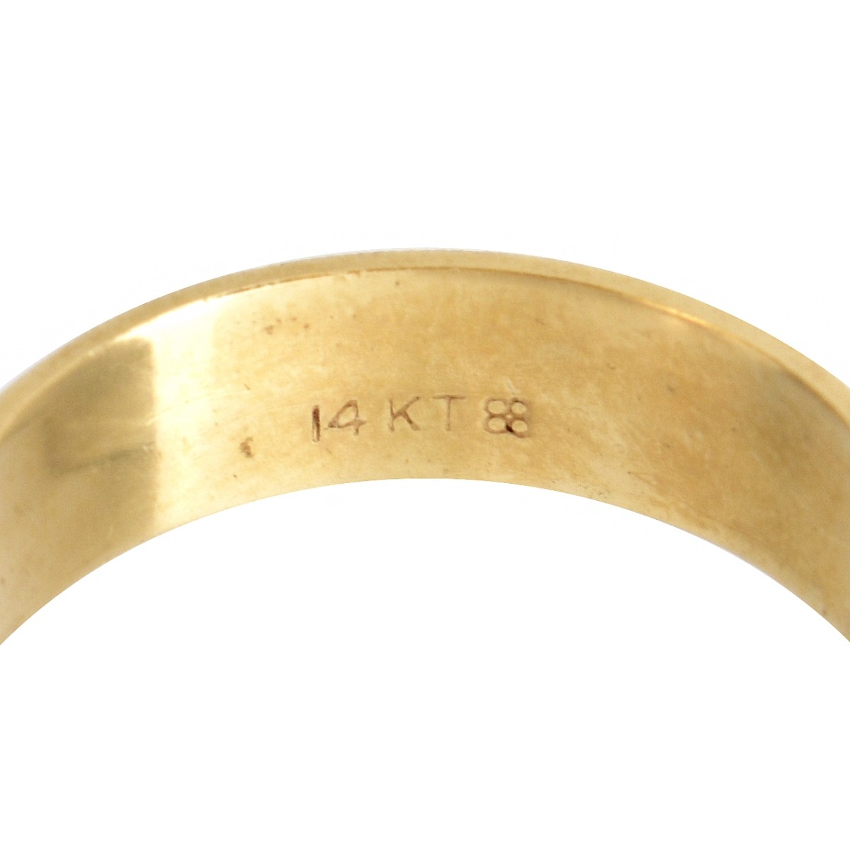 Vintage 14 Karat Yellow Gold and Approx. 1.50 Carat Round Brilliant Cut Cubic Zirconia Engagement Ring. Ring size 9-1/2. Approx. weight: 6.59 grams. Estimate: $200.00 - $300.00 Domestic Shipping: $40.00 Condition: Very good vintage condition.
