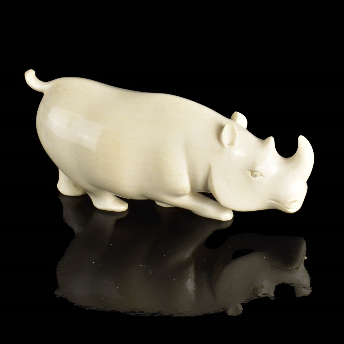 Early 20th Century African Carved Rhinoceros Figurine. Measures 3-1/2" x 2-5/8" x 7-3/8". We Will Not Ship This Item Out of State of Florida. Anyone Having This Item Shipped Must Have a Florida Address or the Item will not be Shipped. We will Not Knowingly Sell Endangered Species outside of Legal Channels. Estimate: $250.00 - $350.00 Domestic Shipping: $62.00 Condition: Normal stress lines otherwise good condition.