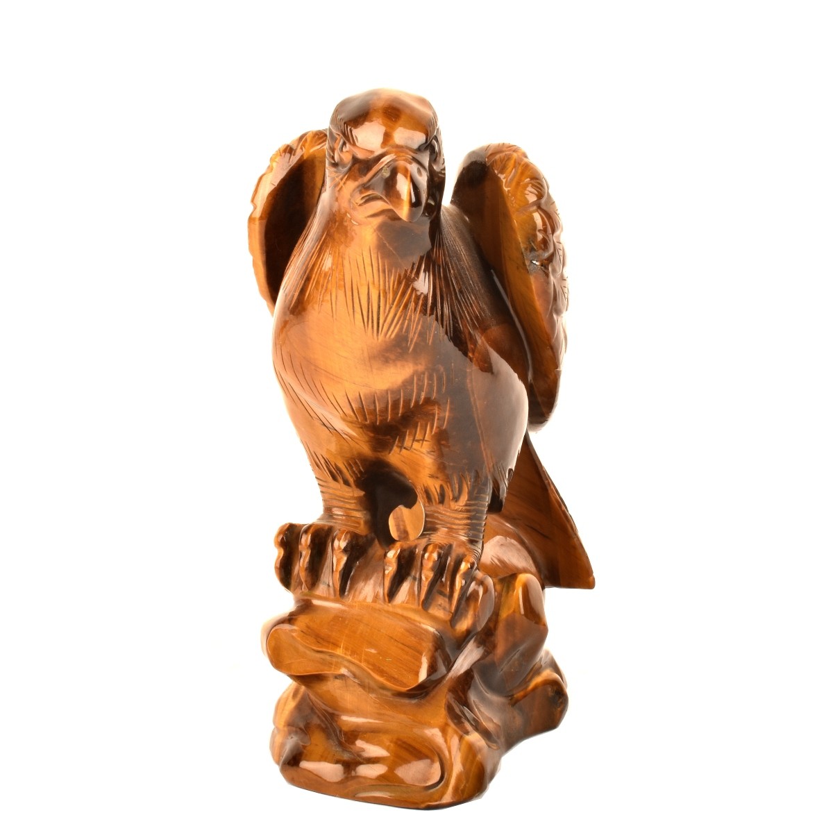 Chinese Carved Tiger Eye Perched Bald Eagle Figurine. Signed on the base. Measures 6-1/4" x 3" x 4-1/2". Estimate: $150.00 - $300.00 Domestic Shipping: $62.00 Condition: Good condition.