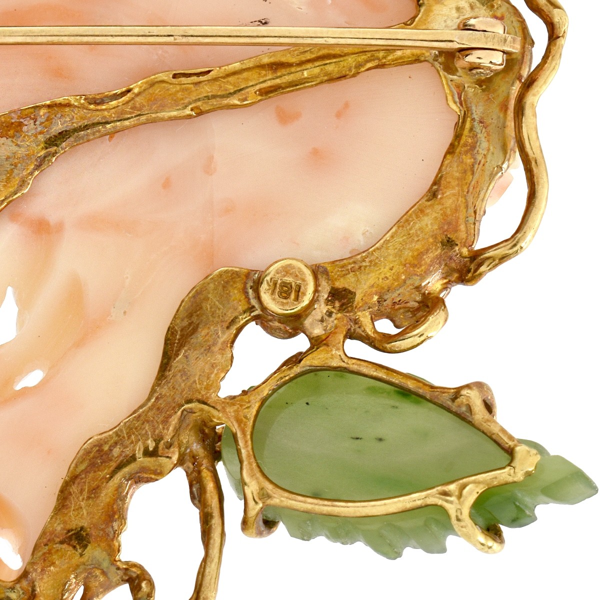 Coral, Jade and 18K Brooch