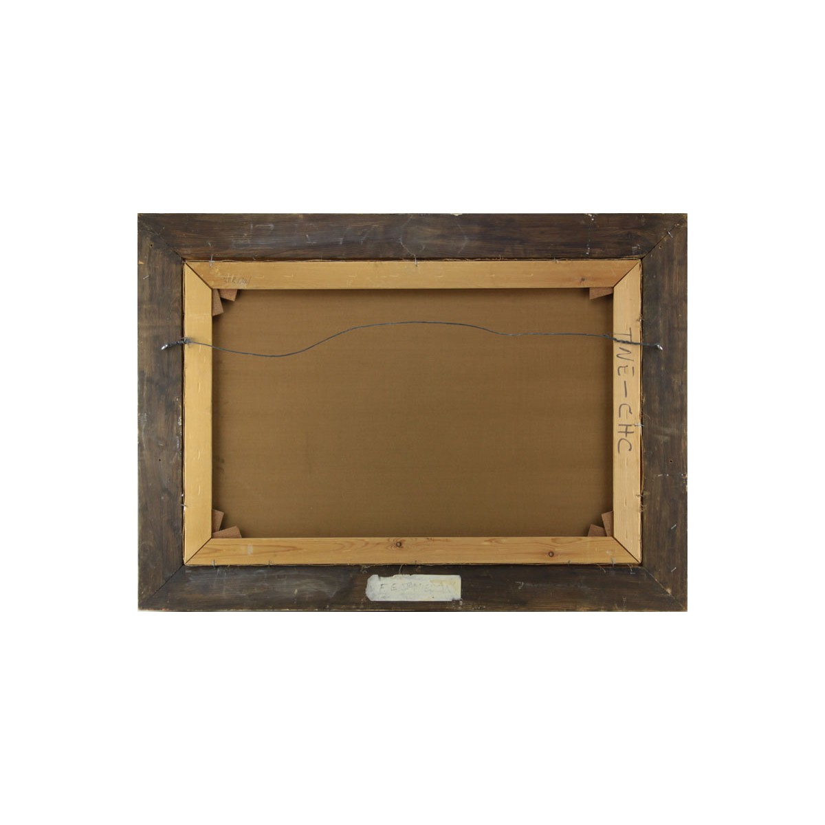 Frank Jameson, British (1898-1968) oil on canvas "Cottage on the Mountian Lake" Signed lower right, old label verso. Measures 20" x 30", frame 26-1/2" x 36-1/2". Estimate: $300.00 - $600.00 Domestic Shipping: Third party Condition: Good condition, frame with losses.