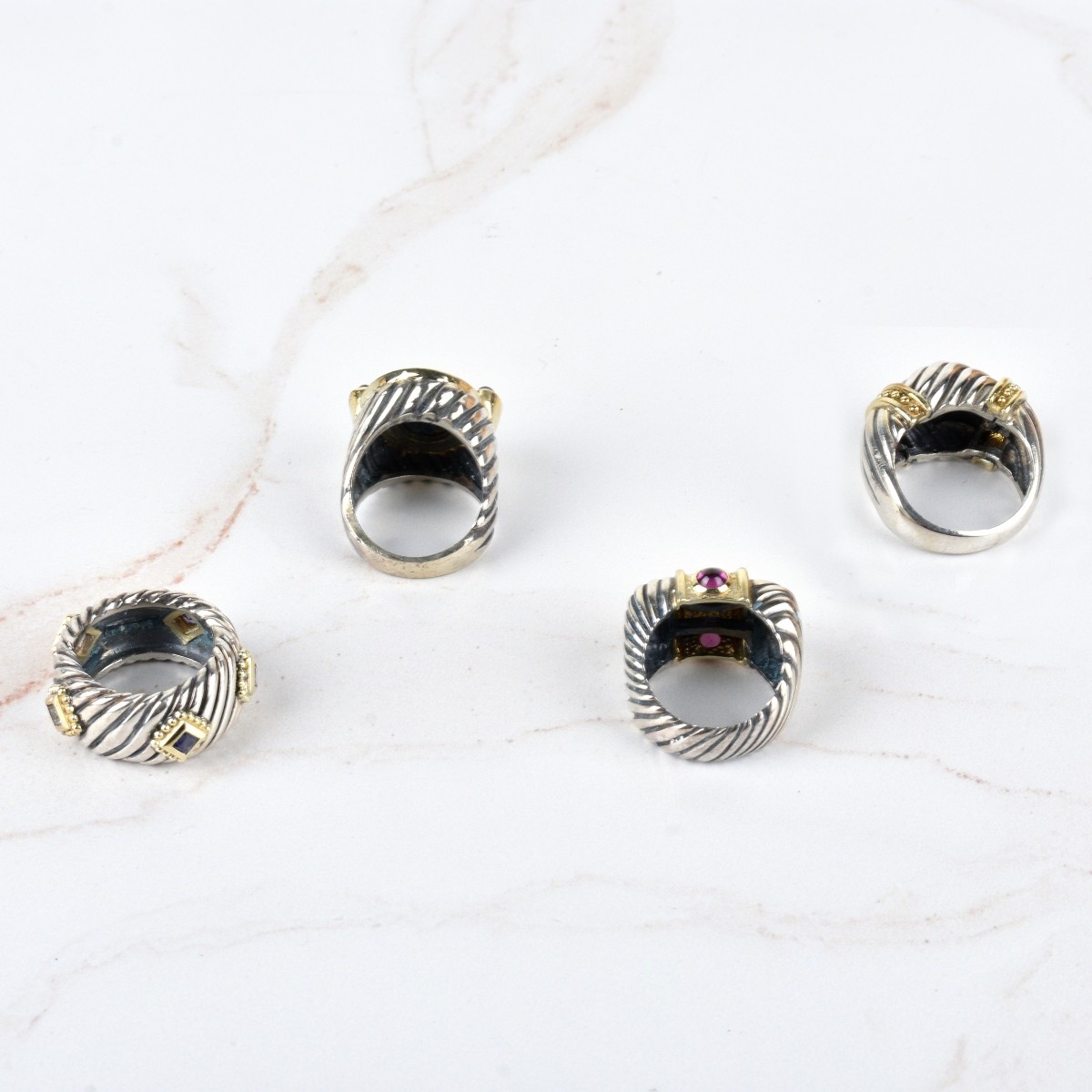 Four Vintage 14 Karat Yellow Gold and Sterling Silver Rings, Three Rings Accented with Small Gemstones. Stamped 14K SS. Ring sizes 5-3/4, 6, 6, 6. Approx. total weight: 53.32 grams. Provenance: Property of a retired jeweler. Estimate: $100.00 - $150.00 Domestic Shipping: $40.00 Condition: As New unused condition.