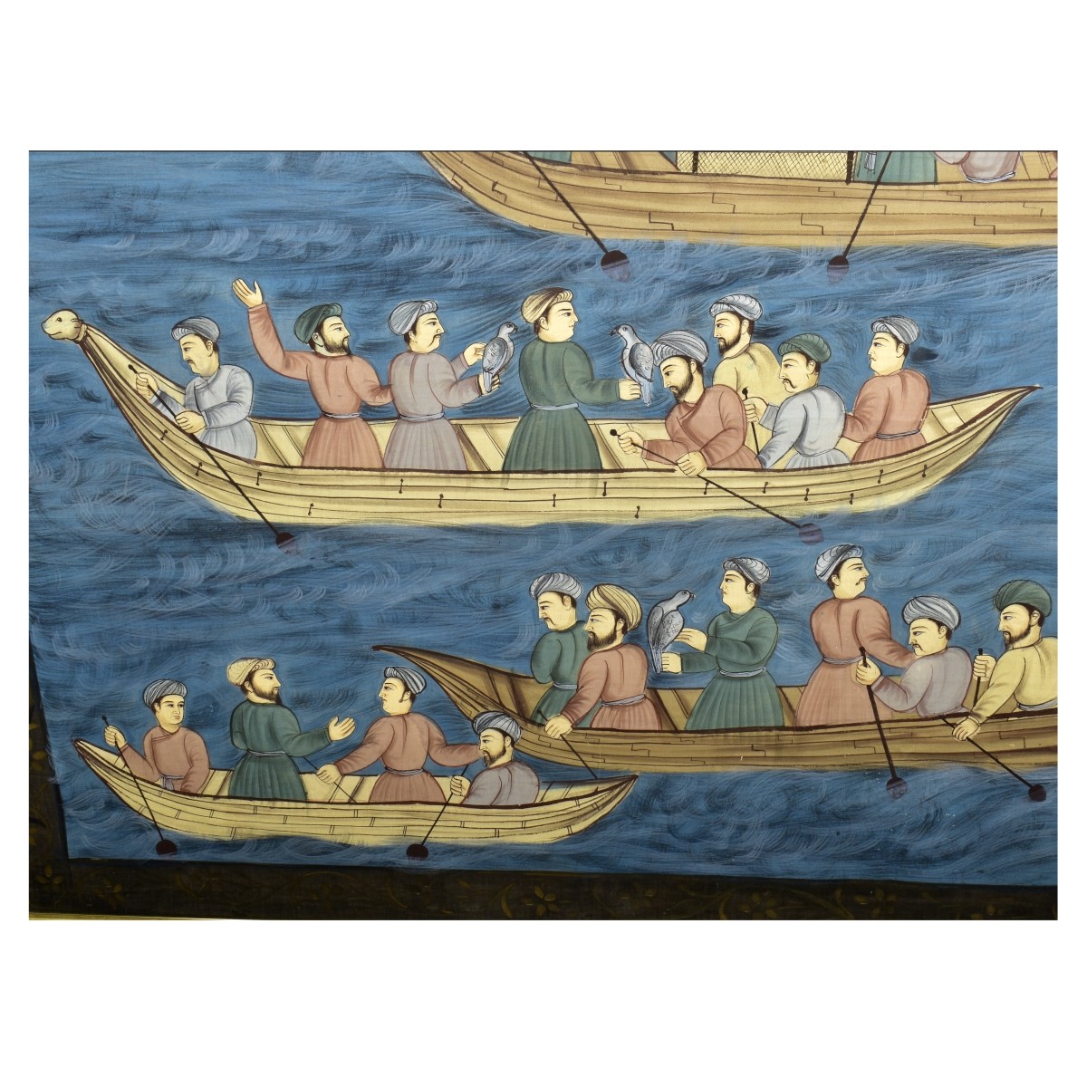 Large Antique Indian Pichwal Painting on Textile "King's Procession" Unsigned. Sight measures 69-1/4" x 44-1/2". Frame measures 72-1/2" x 47-3/4". Estimate: $300.00 - $500.00 Domestic Shipping: Third party Condition: Good condition.