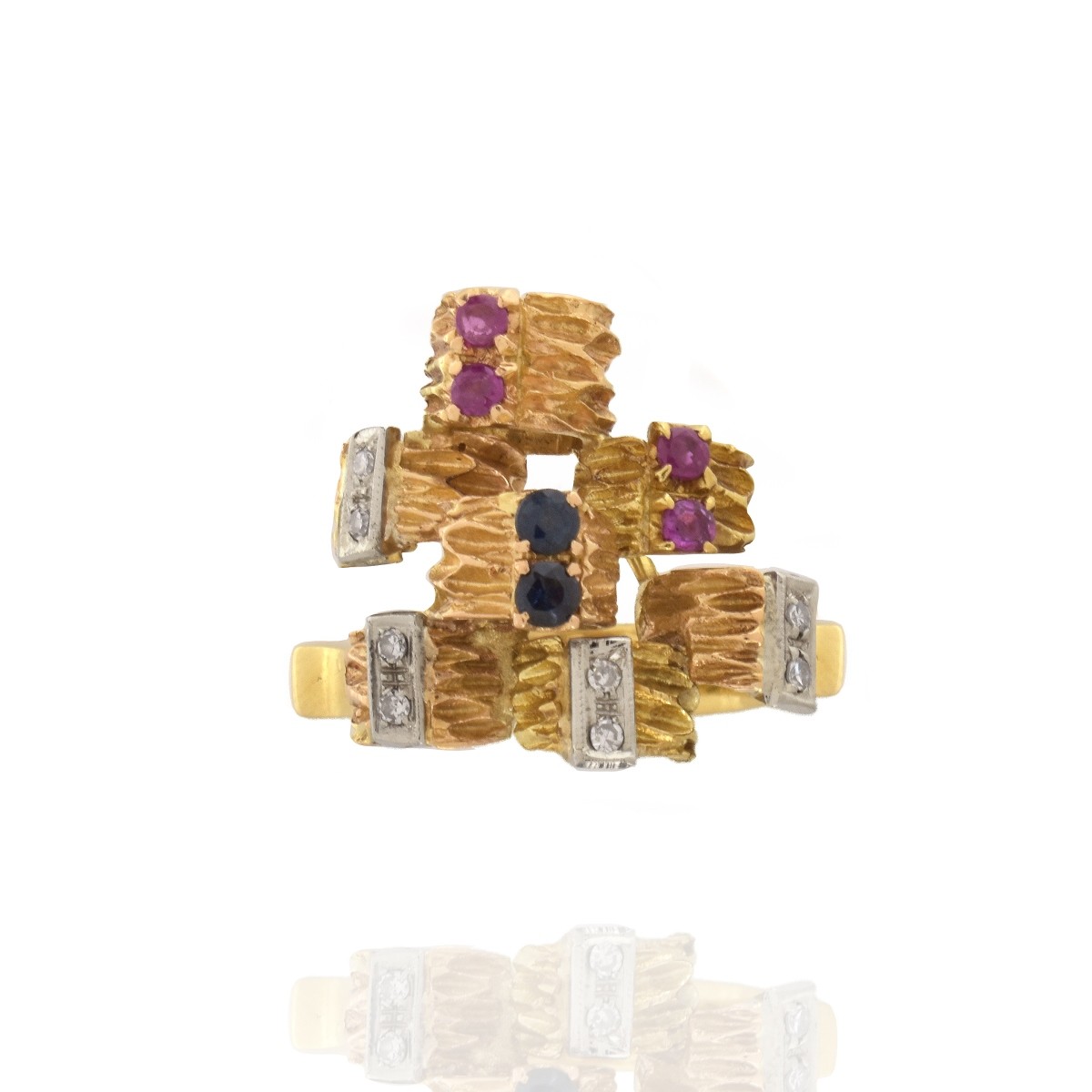 Vintage Gemstone and 18 Karat Yellow Gold Ring. Set with small round cut diamonds, rubies and sapphires. Stamped 750. Ring size 7-1/2. Approx. weight: 11.60 grams. Estimate: $500.00 - $700.00 Domestic Shipping: $32.00 Condition: Very good vintage condition.