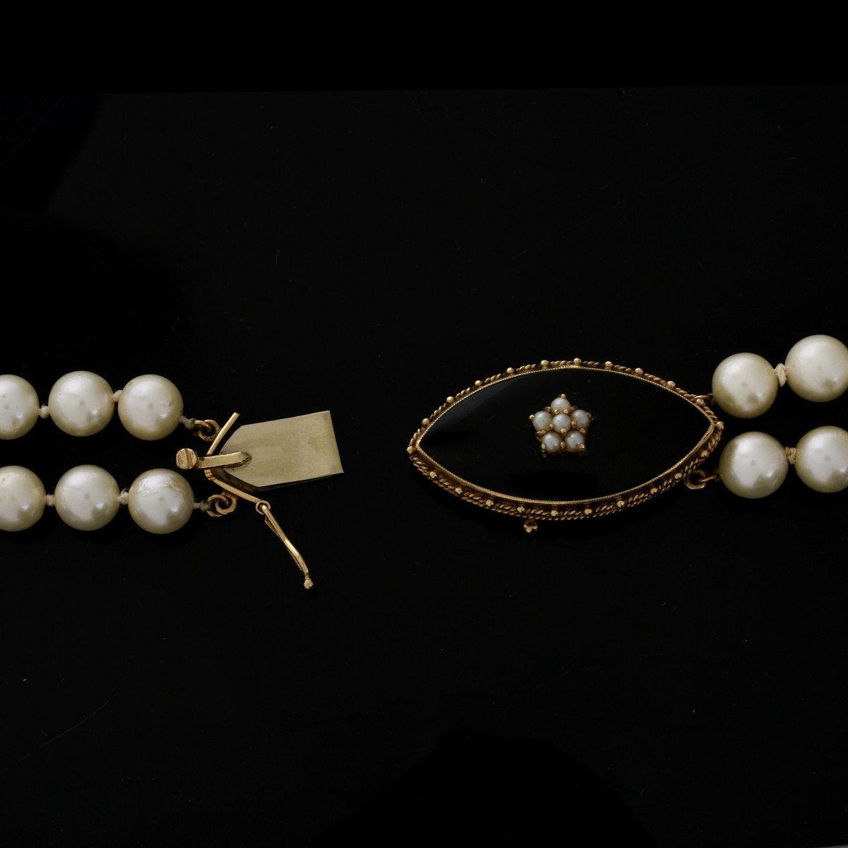 Vintage Double Strand 7.0-7.5mm Pearl Necklace with Black Onyx, Seed Pearl and 14 Karat Yellow Gold Clasp. Pearls with good polish and luster. Clasp stamped 14K. Measures 25-1/2" L. Approx. weight: 95.65 grams. Estimate: $400.00 - $600.00 Domestic Shipping: $40.00 Condition: Very good vintage condition.
