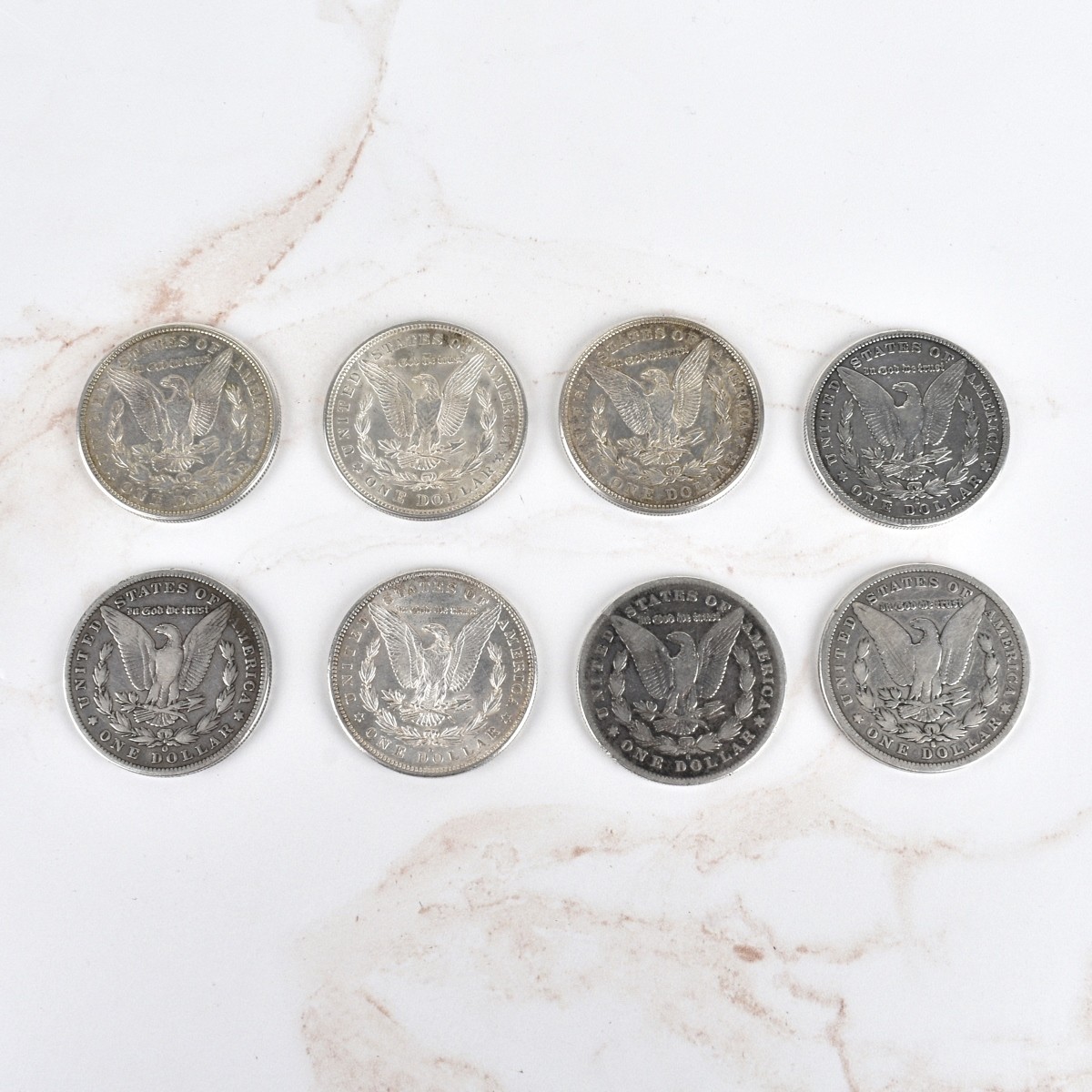 Eight US Morgan Silver $1 Coins. To include: 1878 S, 1879 S, 1891 S, 1894 S, 1901 O, (3) 1921. Estimate: $250.00 - $300.00 Domestic Shipping: $40.00 Condition: Circulated condition. Not professionally graded.