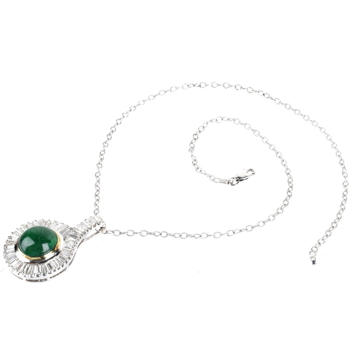 GIA Certified 13.42 Carat Double Cabochon Colombian Emerald, 5.50 Carat TW Tapered Baguette Diamond and 18 Karat White and Yellow Gold Pendant with 14 Karat White Gold Chain. Emerald with vivid color. Diamonds F-G color, VS clarity. Pendant measures 1-5/8" L, 1" W; chain measures 18" L. Approx. total weight: 24.20 grams. Estimate: $15,000.00 - $20,000.00 Domestic Shipping: $40.00 Condition: Very good condition. For additional information and/or WhatsApp video please contact our resident GIA Graduate Gemologist, Russ Kodner at 954.650.5030