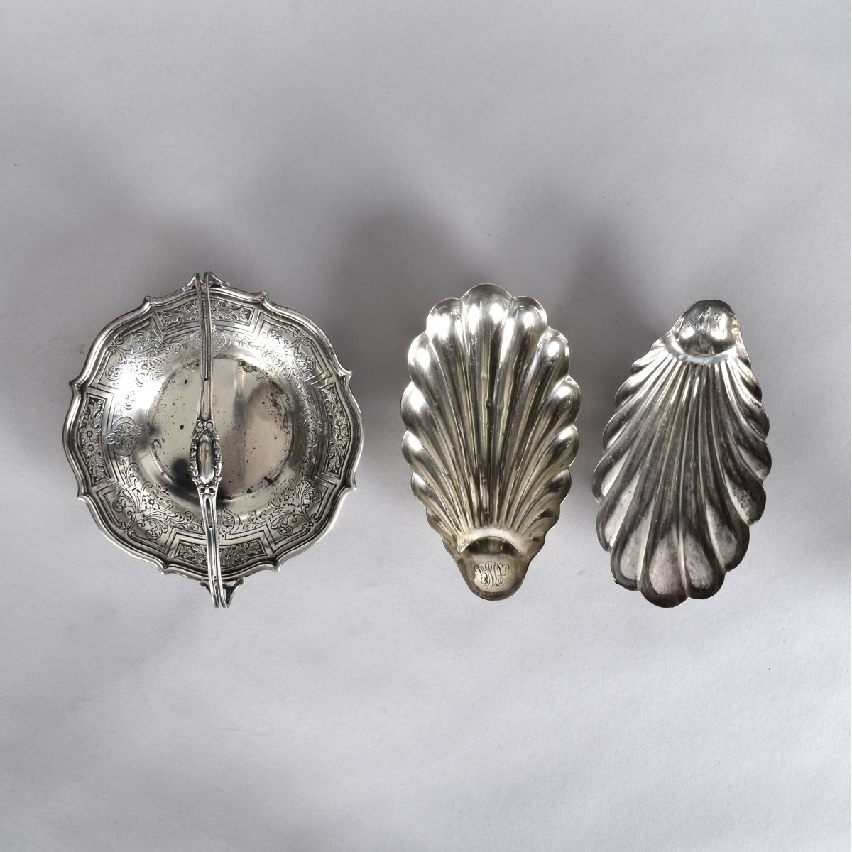 Three Vintage / Antique Sterling Silver Dishes. To include a Gorham handled basket with engraved floral design and two shell dishes with monogram. Stamped sterling. Gorham basket measures 3-1/4" H, 6-1/8" W. Shell dishes measure 6-1/8" x 3-1/2". Approx. total weight: 8.50 troy ounces. Estimate: $100.00 - $200.00 Domestic Shipping: $48.00 Condition: Good vintage / antique condition. A few minor dings to shell dishes. Need polishing.