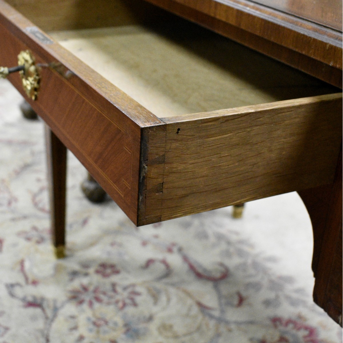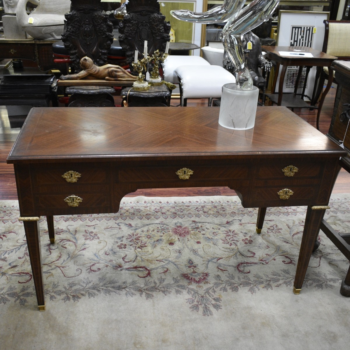 Mid 20th Century Louis XVI-style Gilt Bronze Mounted Rosewood Desk. Opening with four drawers and with a tooled leather sliding tierette to each side. Unsigned. Measures 30" H, 52" W, 24-1/2" D. Estimate: $250.00 - $500.00 Domestic Shipping: Third party Condition: Good vintage condition. Light surface wear and scratches consistent with age and normal use.