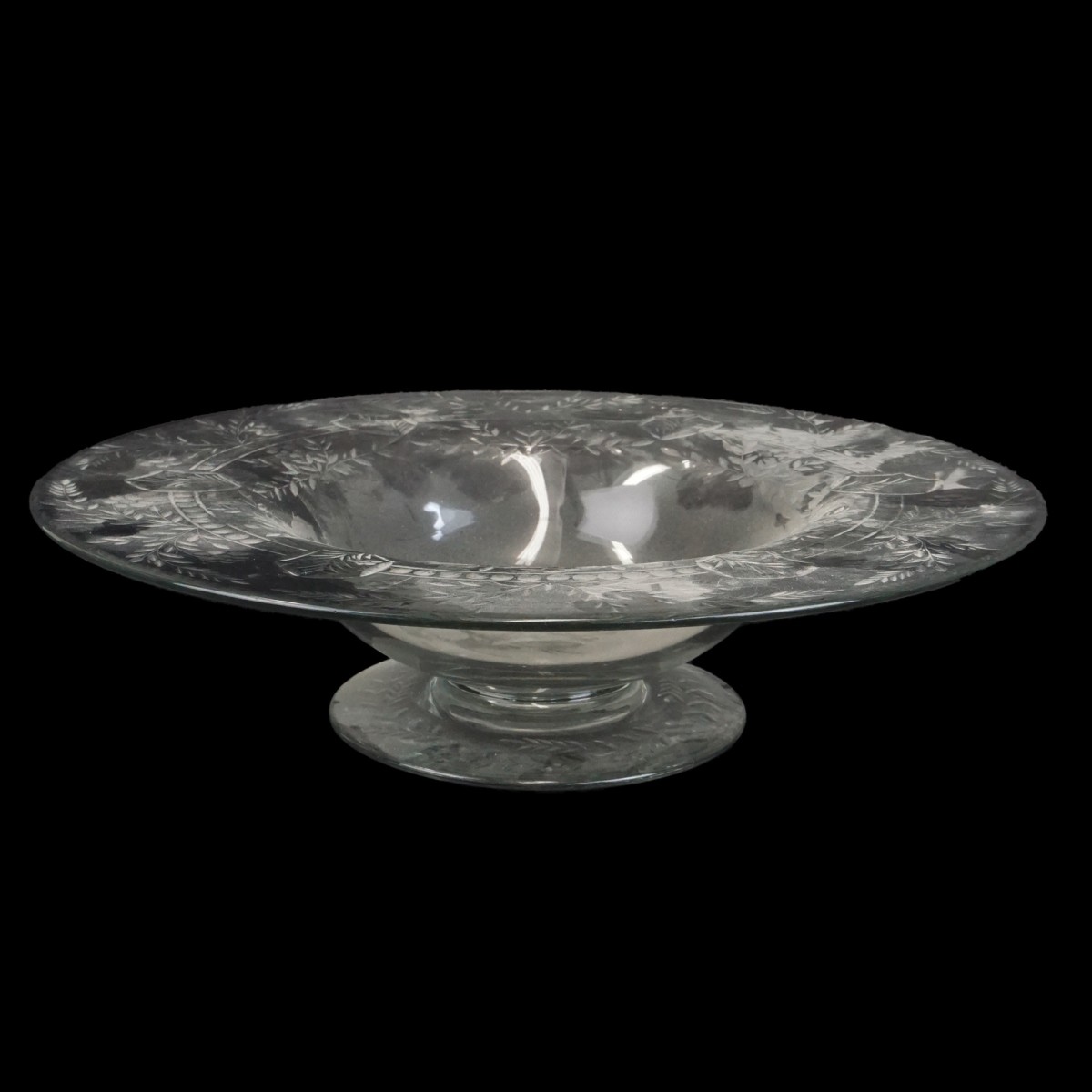 Grouping of Seventeen (17) Glastonbury-Lotus 67-3 Etched Crystal Tableware. Includes (14) plates, a pair of candlesticks, and a footed centerpiece bowl. Plates measuring 8-5/8". Candlesticks measures 13" H, centerpiece measures 3-5/8" x 13-3/4". Estimate: $80.00 - $200.00 Domestic Shipping: Third party Condition: Good condition.