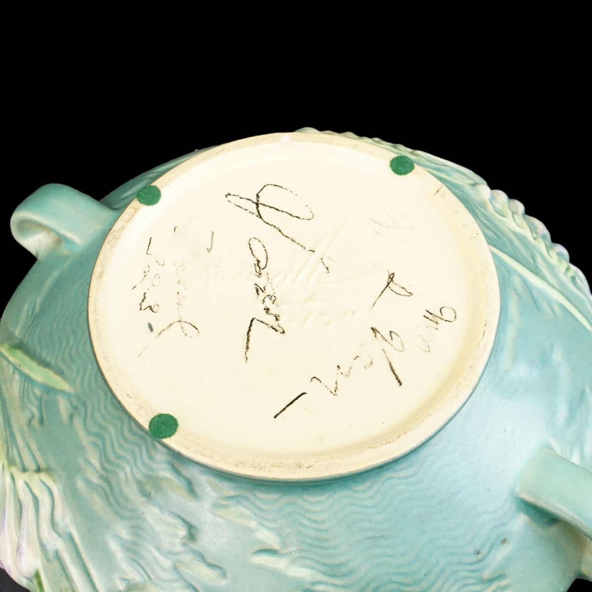 Roseville "Freesia" Pottery Handled Bowl. Signed on the base. Measures 4-1/8" x 13" W with handles. Estimate: $160.00 - $300.00 Domestic Shipping: Third party Condition: Very small nick to one of the handles otherwise very good condition.