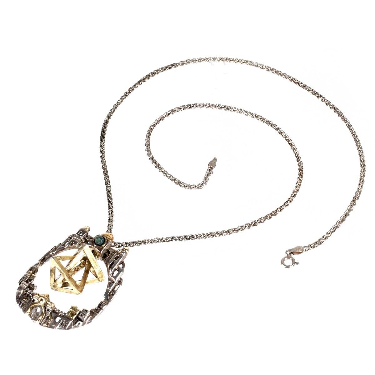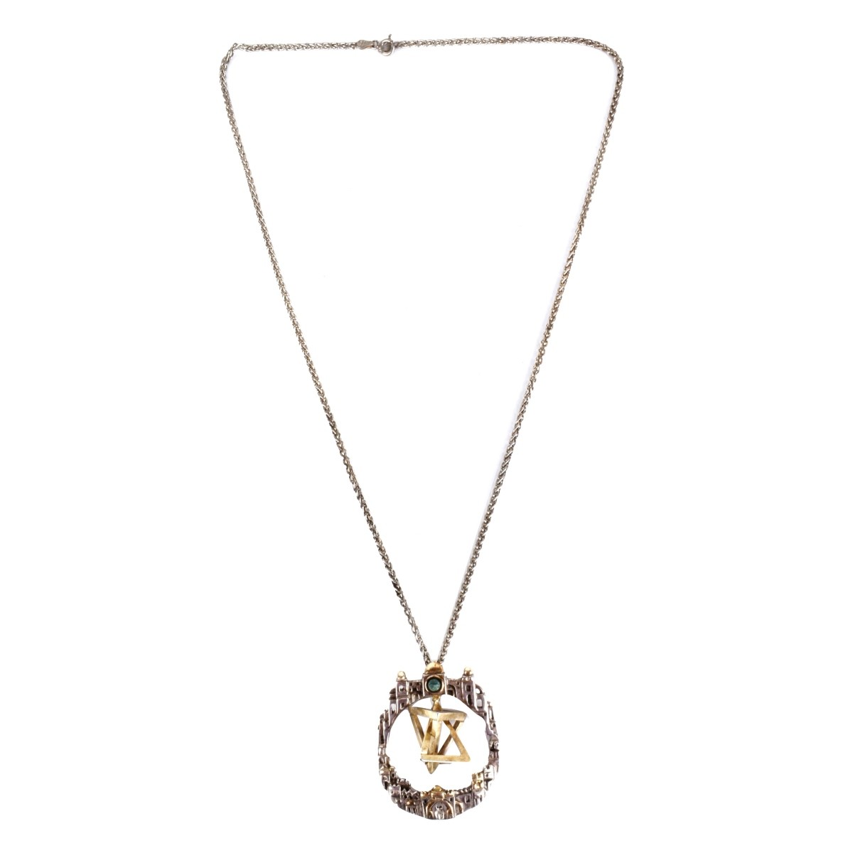 Vintage Frank Meisler, Israel Sterling Silver Judaic Pendant Necklace with Three Dimensional Star of David and Accented with a Eilat Stone. Signed, stamped 925. Pendant measures 2" L, 1-1/2" W; chain measures 23" L. Approx. total weight: 32.63 grams. With box. Condition: Good vintage condition. Needs polishing. Estimate: $250.00 - $500.00 Domestic Shipping: $40.00
