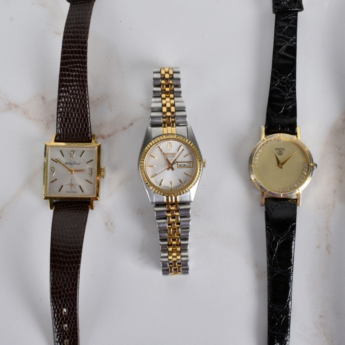 Collection of Seven Vintage Lady's Fashion Watches. To include Seiko, Mathey-Tissot, Movado and others. Swiss quartz movements. Seiko with two tone stainless bracelet, case measures 24mm. Remaining six with leather bracelets. Condition: Good pro-owned condition. Appear to need batteries. Wear to Movado and Mathey-Tissot leather bracelets. Please note the gallery does not warranty the running condition of watches. Estimate: $200.00 - $300.00 Domestic Shipping: $42.00