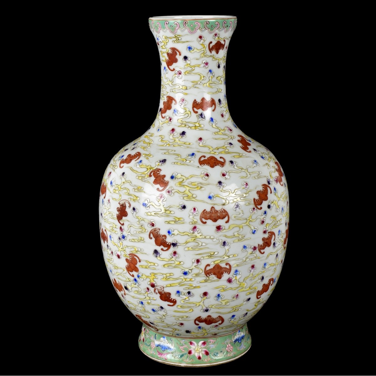 Large Chinese Famille Rose Fu Bats Porcelain Vase. Signed. Measures 13" x 7-1/4". Condition: Good condition. Estimate: $200.00 - $500.00 Domestic Shipping: $88.00