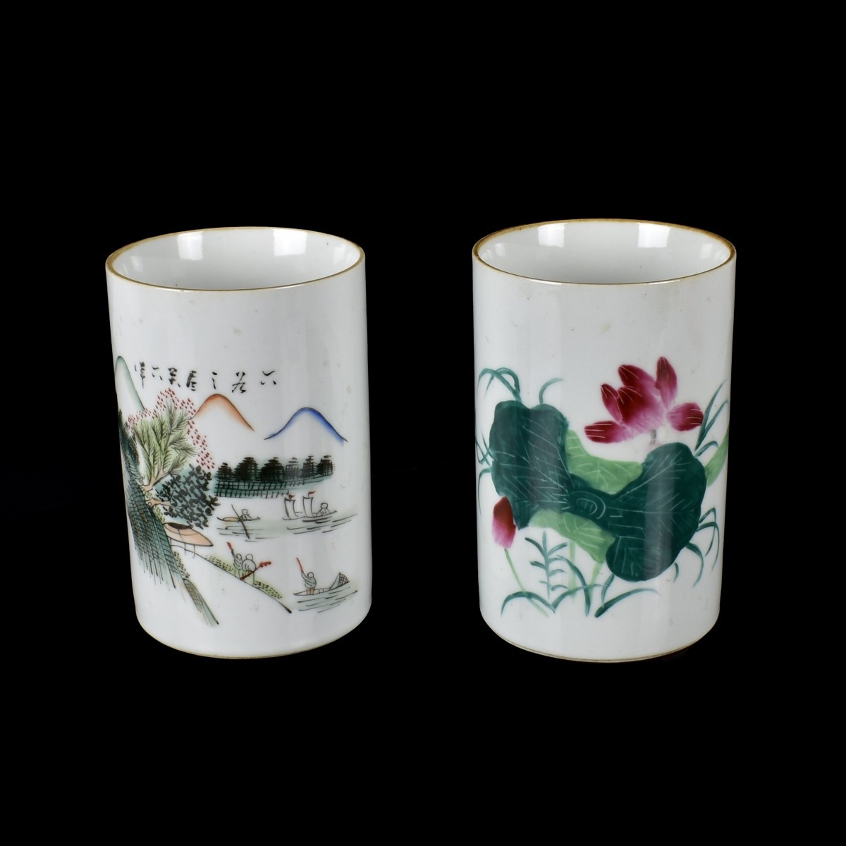 Grouping of Two Chinese Famille Rose Porcelain Brush Washers. Signed on the base. One vase has a poem inscription. Each measuring 5" x 3-1/4". Condition: Good condition. Estimate: $100.00 - $300.00 Domestic Shipping: $58.00