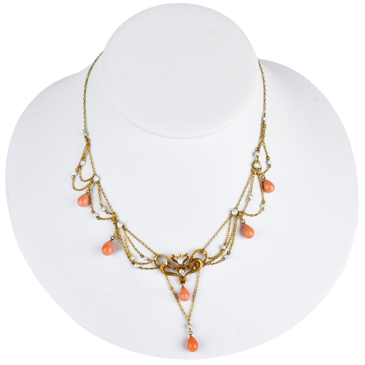 Antique Art Nouveau Coral, Seed Pearl and 14 Karat Yellow Gold Necklace with Small Old European Cut Diamond Accent. Measures 15-1/4" L, 2" drop. Approx. weight: 10.36 grams. Condition: Very good antique condition. For additional information and/or WhatsApp video please contact our resident GIA Graduate Gemologist, Russ Kodner at 954.650.5030 Estimate: $1000.00 - $1500.00 Domestic Shipping: $40.00