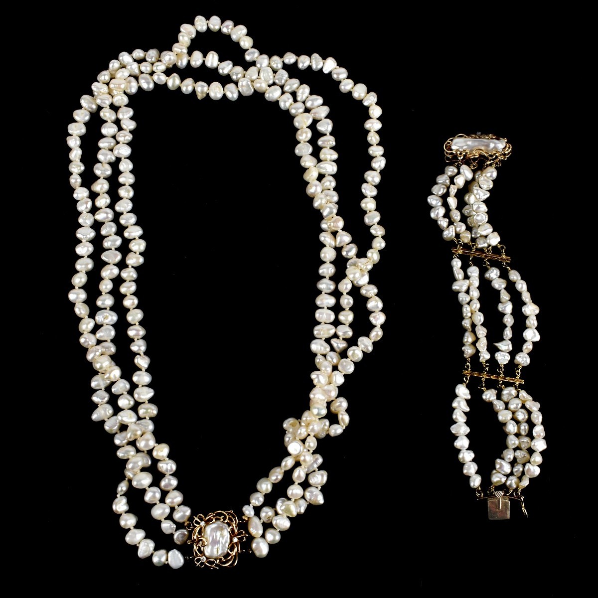 Vintage Three Strand Baroque Pearl and 14 Karat Yellow Gold Necklace & Four Strand Baroque Pearl and 14 Karat Yellow Gold Bracelet. Each clasp accented with small round brilliant cut diamonds. Necklace measures 23-1/2" L; bracelet measures 6-1/2" L, 1" W. Approx. total weight: 137.19 grams. Condition: Very good condition. Estimate: $500.00 - $700.00 Domestic Shipping: $40.00